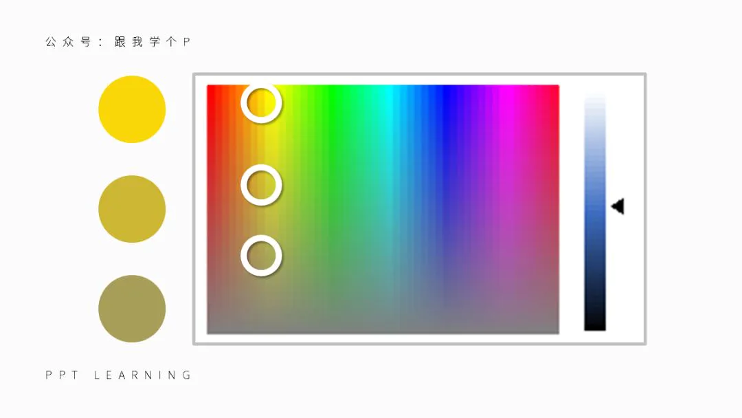 上面是一张还未配色的PPT,我们先试着在颜色表左侧的垂直方向上随便取几个颜色: