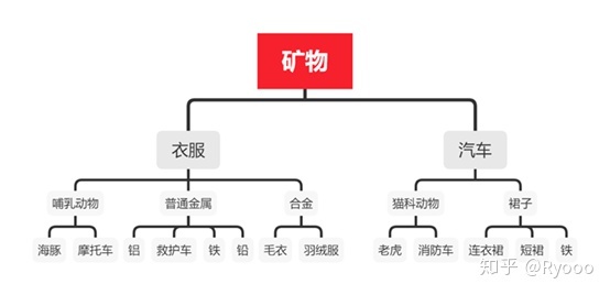 当然,这个实验只表明了一种趋势,并没有体现组织信息和不组织信息在记忆效率上的差异。因此,1969 年 Gordon Bower 及其同事做了一个对比实验来对比组织信息和不组织信息在记忆效率上的差别[12]。实验中,被试会看到关于矿物、动物、衣服和交通工具四个方面的一系列词语,词语都以树状图的形式呈现。被试分为两组,实验组看到的树状图是完全按概念层级进行组织的(如图 1),而对照组看到的树状图则是随机组织、或者说是没有组织的(如图 2)。实验结果发现,实验组的被试平均回忆起了 73 个词,而对照组的被试平均只回忆起了 21 个词。这个实验证明了经某种方式组织过的信息更容易被记忆。