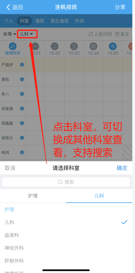 - 全院有多分院,单日值班人员较多的,建议切换为单日查询总值班,更清晰