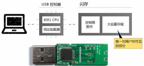 <br />U盘由芯片控制器和闪存两部分组成,芯片控制器负责与PC的通讯和识别,闪存用来做数据存储;闪存中有一部分区域用来存放U盘的固件,它的作用类似于操作系统,控制软硬件交互;固件无法通过普通手段进行读取。