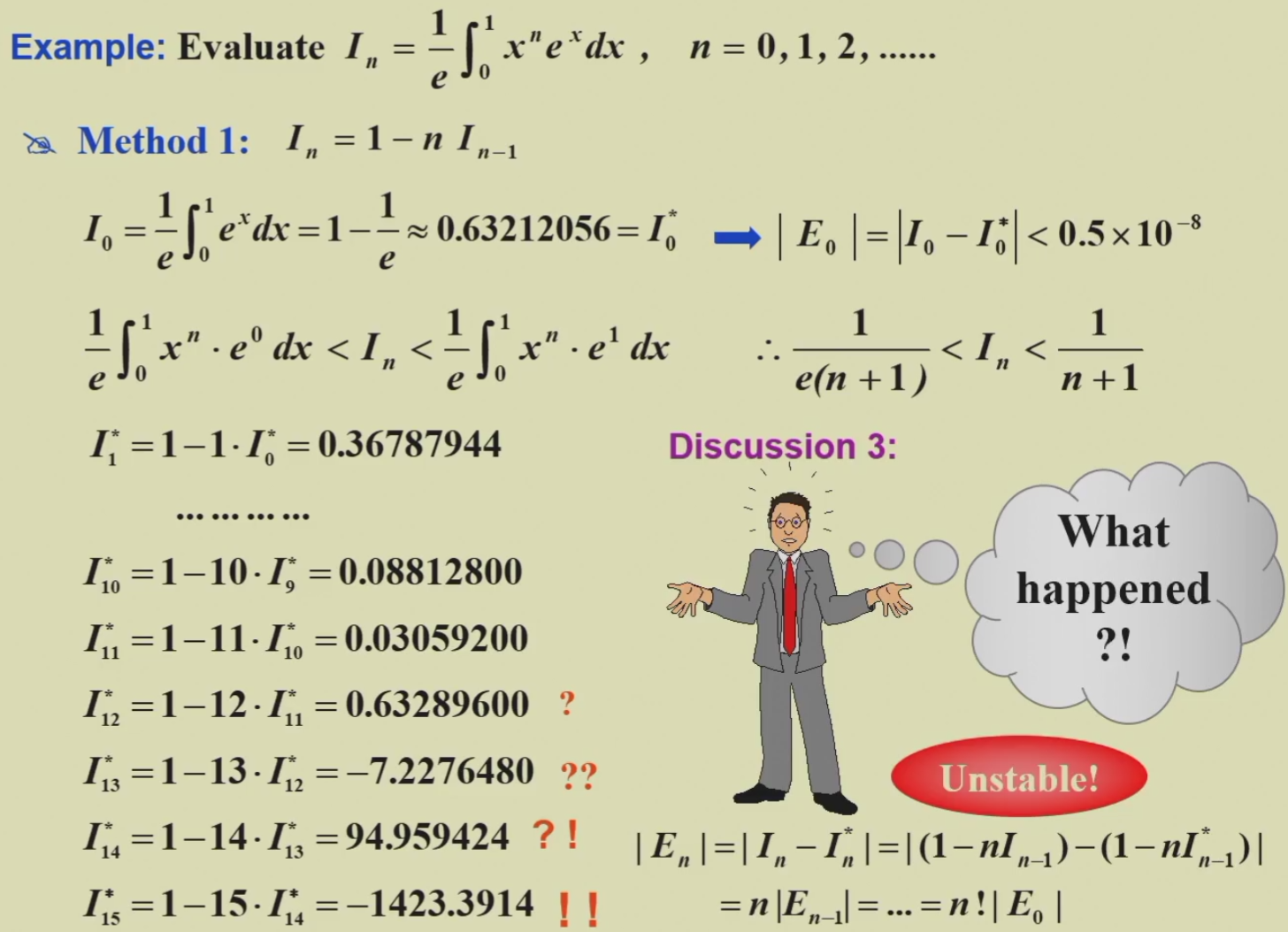 💡Linear growth of error is usually unavoidable, and when C and E0 are small the results are generally acceptable. Exponential growth of error should be avoided since the term Cn becomes large for even relatively small values of n. This leads to unacceptable inaccuracies, regardless of the size of E0. 而且很多情况下出现指数增长不是因为实际情形太复杂,而是因为代码写成了屎山(老师原话)。