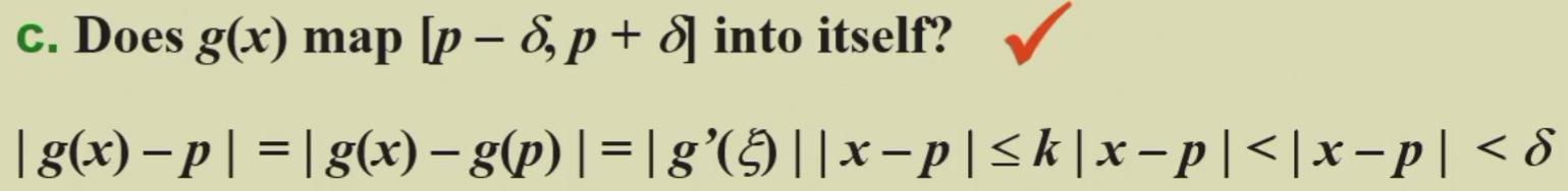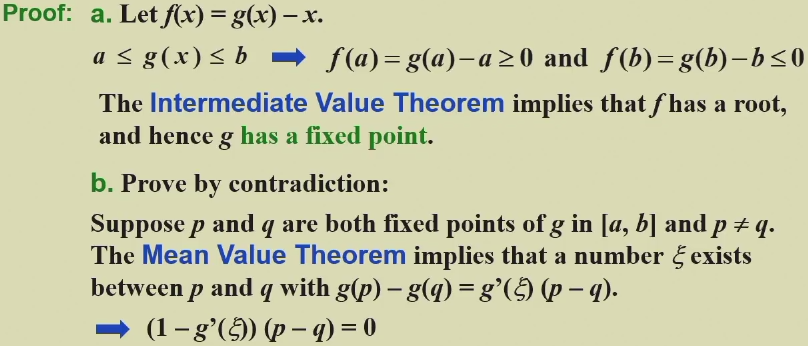 Let g ∈ C[a, b] be such that g(x) ∈ [a, b], for all x in [a, b]. Suppose, in addition, that g’ exists on (a, b) and that a constant 0<k<1 exists with |g’(x)| ≤ k for all x ∈ (a, b). Then, for any number p0 in [a, b], the sequence defined by pn=g(pn-1), n ≥ 1, converges to the unique fixed-point p in [a,b].