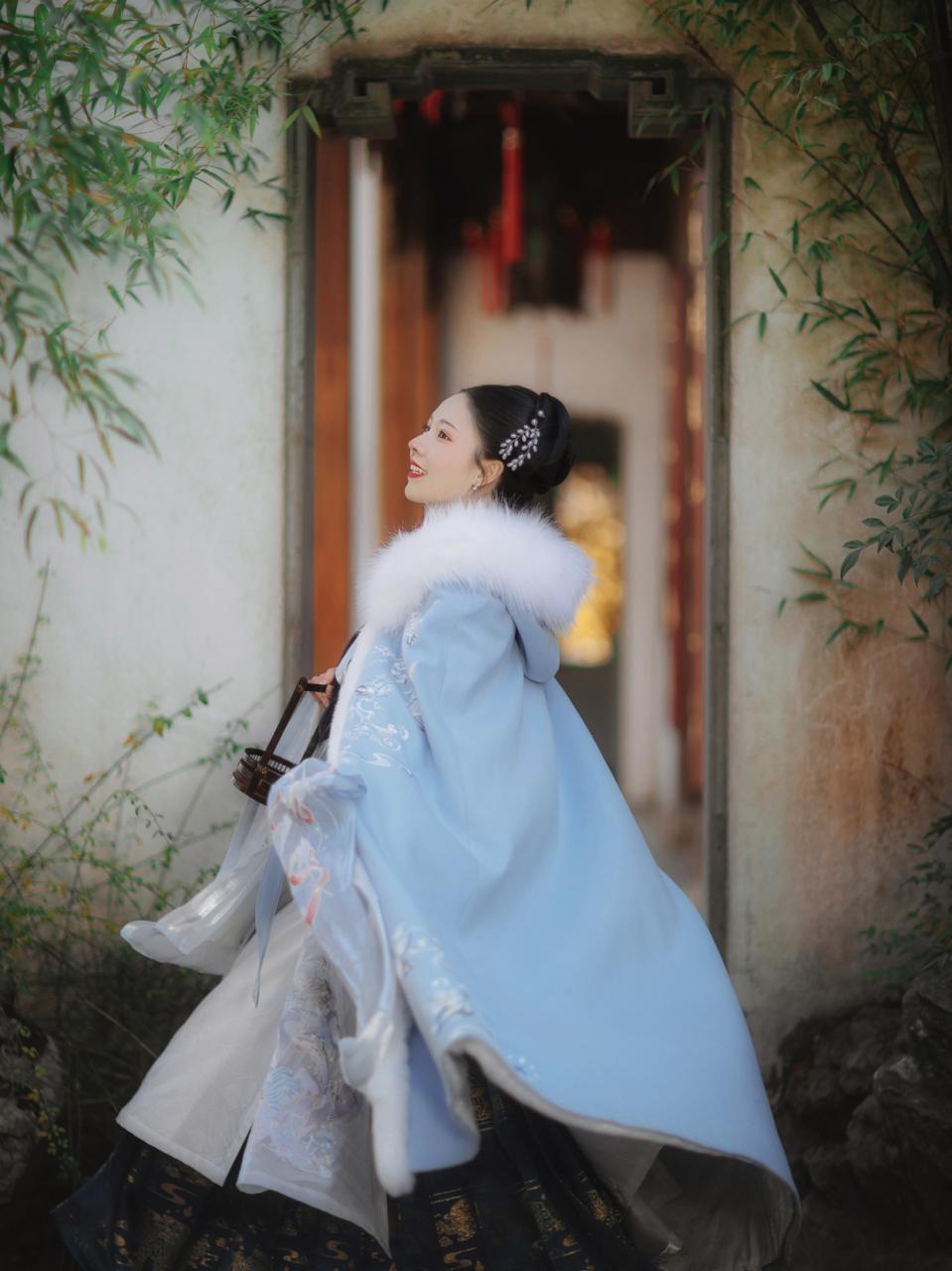 最后这一身斗篷的设计比较的短,适合日常款式,或者是现代款式汉服的搭配,出门的时候也比较方便一些。它的色调是偏向于纯白色的米白色,整体是冷色调,上面的绣花图案也是冷色调的蓝色花卉。