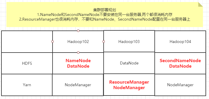 - 集群配置- 注意事项- NameNode和SecondNameNode不要安装在同一台服务器,两个都很消耗内存- ResourceManager也很消耗内存,不要和NameNode、SecondNameNode配置在同一台服务器- 配置文件说明:Hadoop配置文件分为两类- 默认配置文件- 要获取的默认文件 文件存放在Hadoop的jar包中的位置- [core-default.xml] hadoop-common-3.1.3.jar/core-default.xml- [hdfs-default.xml] hadoop-common-3.1.3.jar/hfds-default.xml- [yarn-default.xml] hadoop-common-3.1.3.jar/yarn-default.xml- [mapred-default.xml] hadoop-common-3.1.3.jar/mapred-default.xml- 自定义配置文件- core-site.xml, hdfs-site.xml, yarn-site.xml, mapred-site.xml,这四个配置文件在$Hadoop_HOME/etc/hadoop这个路径上,用户可以根据自己的需求进行重新配置(NN,2NN, RM等的部署)。- 部署核心配置文件--core-site.xml- 这里可以①**设置NameNode的地址;②指定Hadoop数据的存储目录;③HDFS网页登录时的静态用户**- **这里要注意修改路径,hadoop版本号可能不一样,在这里踩过坑,要注意!!**```shell<!-- 指定 hadoop 数据的存储目录,内部通信端口8020 --><property><name>fs.defaultFS</name><value>hdfs://hadoop102:8020</value></property><!-- 指定 hadoop 数据的存储目录 --><property><name>hadoop.tmp.dir</name><value>/opt/module/hadoop-3.1.4/data</value></property><!-- 配置 HDFS 网页登录使用的静态用户为 Hishark --><property><name>hadoop.http.staticuser.user</name><value>Hishark</value></property>