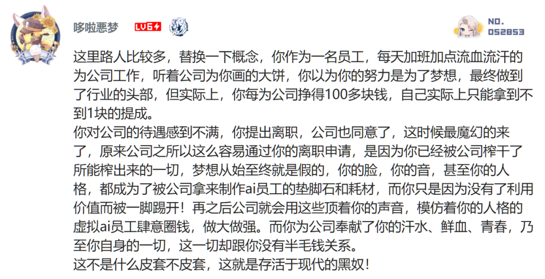 但这次事件引起如此大的反响,是因为从爆出来的种种细节来看,行业里的确存在恶劣的工作环境,和不公的利益分配。虚拟偶像的外在越是光鲜可爱,粉丝在虚拟偶像上投注的情感越是真挚浓烈,就越是反衬出身心受伤的从业者有多么的窘迫惨淡。