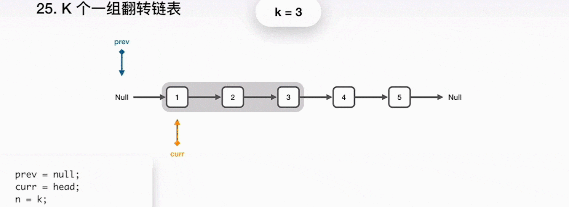 //我们首先确定了哪个是当前节点,第1步指定了next节点是什么 //第二步让当前节点的next指向自己的上一个节点 //第3步和第4步的意思是让当前节点和下个节点向后推进,k—指的是这组链表已经处理了一个元素