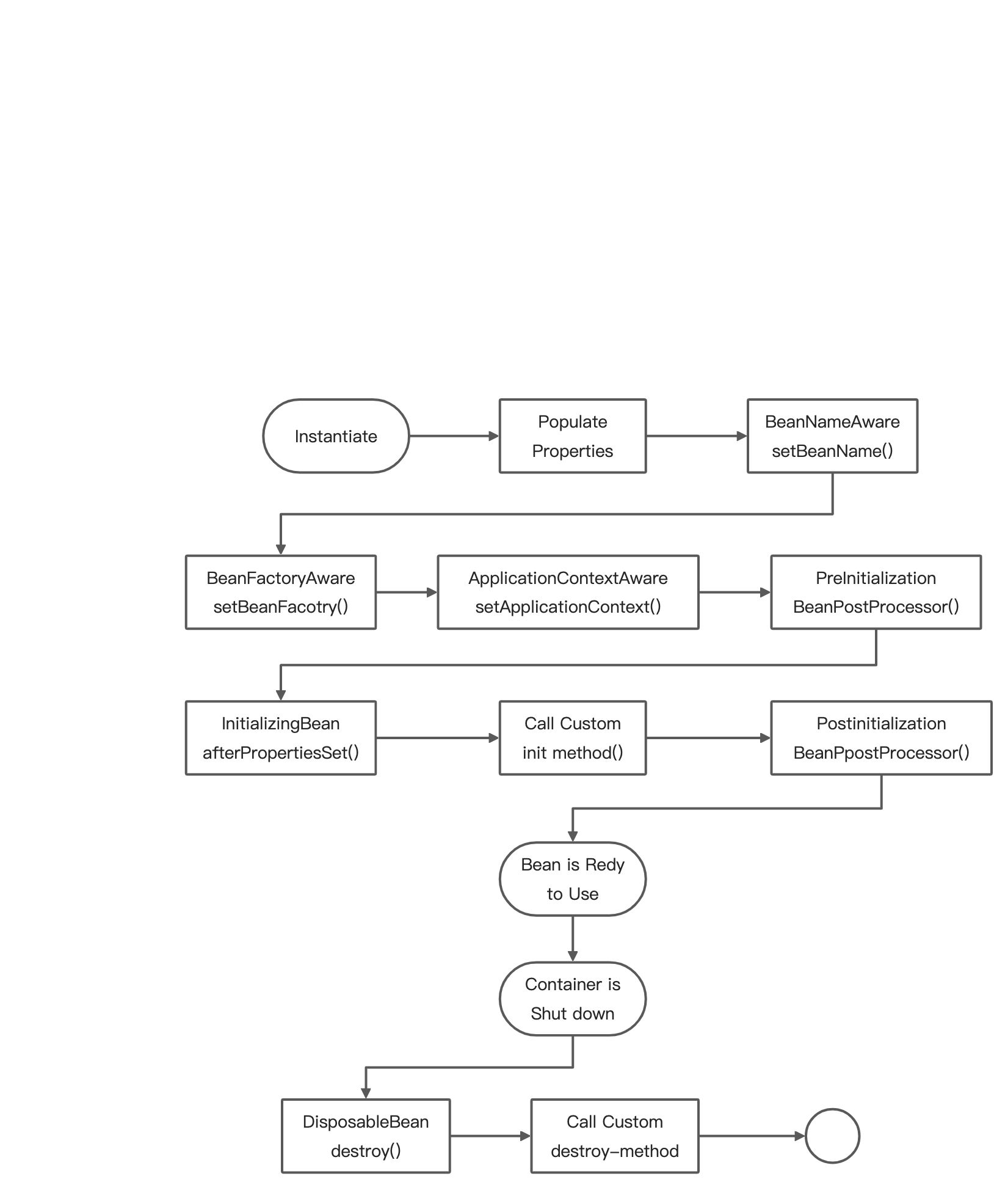**8.Spring启动流程**<br />这个流程,网上一搜基本都是这张图了,那其实主要的流程就几个步骤:1. 准备环境,根据不同的环境创建不同的Environment1. 准备、加载上下文,为不同的环境选择不同的Spring Context,然后加载资源,配置Bean1. 初始化,这个阶段刷新Spring Context,启动应用1. 最后结束流程[](https://www.cnblogs.com/sword-successful/p/11383723.html)**8.Spring事务实现与传播机制**- **PROPAGATION_REQUIRED**:如果当前没有事务,就创建一个新事务,如果当前存在事务,就加入该事务,这也是通常我们的默认选择。- **PROPAGATION_REQUIRES_NEW**:创建新事务,无论当前存不存在事务,都创建新事务。- PROPAGATION_NESTED:如果当前存在事务,则在嵌套事务内执行。如果当前没有事务,则按REQUIRED属性执行。- PROPAGATION_NOT_SUPPORTED:以非事务方式执行操作,如果当前存在事务,就把当前事务挂起。- PROPAGATION_NEVER:以非事务方式执行,如果当前存在事务,则抛出异常。- PROPAGATION_MANDATORY:支持当前事务,如果当前存在事务,就加入该事务,如果当前不存在事务,就抛出异常。- PROPAGATION_SUPPORTS:支持当前事务,如果当前存在事务,就加入该事务,如果当前不存在事务,就以非事务执行。‘**9.依赖注入模式有哪些?****依赖注入是一种解决类之间依赖关系的设计模式,而其依赖关系只是对象属性。必需使用构造方法注入或setter注入为依赖对象构造注入器,构造方法注入是在创建赋值这些对象属性以实例化对象的方法之一。**| 构造方法注入 | setter注入 || --- | --- || 拥有构造方法的类接受参数,有时非常紧凑,并且很清楚创建了什么 | 对象是构造的,但不清楚其属性是否已经初始化 || 当依赖项是必需的时候,这是一个非常好的选择 | 当依赖项不是必需的时候,是个合适的选择 || 允许隐藏不可变的对象属性,因为它没有这些对象的set方法,要确保对象的不可变性,请使用构造方法注入模式 | 不能保证对象的不可变性 || 可能在应用程序中创建循环依赖项 | 可以解决应用程序中的循环依赖问题 |**10.理解Bean作用域**<br />在Spring中,每个Bean在容器中都有一个作用域。 这不仅可控制Bean的元数据和生命周期,还可以控制这个Bean的作用域,我们可以创建自定义的作用域,然后将其注册到容器中。- 单例作用域:Spring应用上下文通过单例作用域来创建Bean,可以有效降低实例化的成本,非常适用于应用中的无状态对象;- 原型作用域:Spring应用上下文提供了原型作用域来保存某些线程不安全的对象状态,以便后面重用.- 会话作用域: 仅为Web环境的每个用户session创建一个新的实例- 请求作用域: 仅为Web环境的每个请求创建一个的新的实例- WebSocket作用域/Refresh作用域/线程作用域也可自定义作用域类,只要实现了org.springframework.Beans.factory.config.scope接口,就可以作为Spring Ioc容器的自定义作用域。如下所示就是自定义的作用域。
