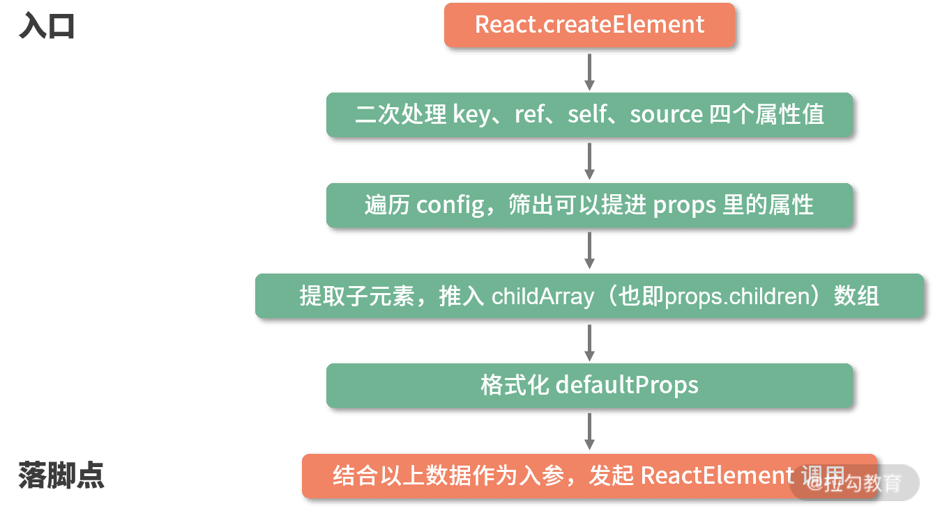 <a name="4Qm7g"></a>#### 函数执行过程`createElement` 中并没有太复杂的涉及算法或真实 DOM 的逻辑,其每一个步骤几乎都是在**格式化数据**。- 它像是**开发者**和 **ReactElement** 调用之间的一个“**转换器**”、一个**数据处理层**,一个**参数中**介。1. 它从`开发者`处**接受**相对简单的**参数**,1. 然后将这些参数按照 `ReactElement` 的预期做一层**格式化,**1. 最终调用 `ReactElement` 来实现**元素的创建**。<a name="4xl6X"></a>### <br /><a name="VnG5f"></a>### ReactElement<a name="8qHB1"></a>#### 源码```javascriptconst ReactElement = function(type, key, ref, self, source, owner, props) {const element = {// REACT_ELEMENT_TYPE是一个常量,用来标识该对象是一个ReactElement$$typeof: REACT_ELEMENT_TYPE,// 内置属性赋值type: type,key: key,ref: ref,props: props,// 记录创造该元素的组件_owner: owner,};//if (__DEV__) {// 这里是一些针对 __DEV__ 环境下的处理}return element;};