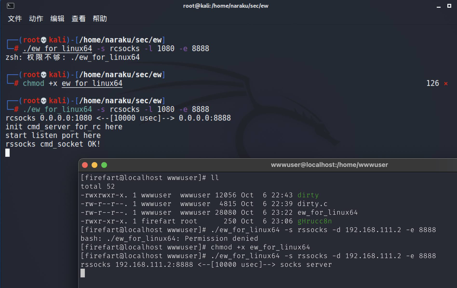 - 也可以使用ew工具,Kali和目标机器Centos都是Linux,因此下载