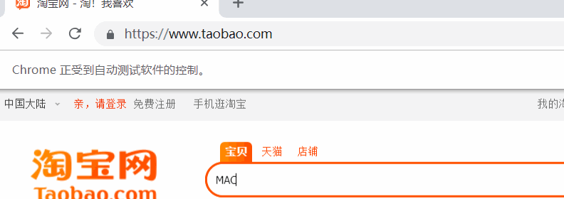 from selenium import webdriverimport timebrowser = webdriver.Chrome()browser.get('https://www.taobao.com') # 打开淘宝input = browser.find_element_by_id('q') # 查询id属性为q的标签,也就是input搜索框!input.send_keys('MAC') # 输入文字MACtime.sleep(1) # 等待1秒input.clear() # 清空文字input.send_keys('IPhone') # 输入文字IPhone# 查询class属性为btn-search的标签,也就是搜索按钮,它是一个button标签button = browser.find_element_by_class_name('btn-search')button.click() # 点击按钮,也就是点击搜索browser.close()