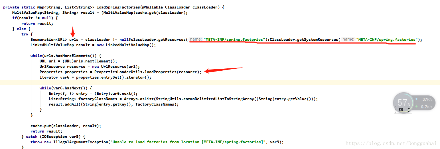 会从META-INF/spring.factories中获取资源,然后通过Properties加载资源:
