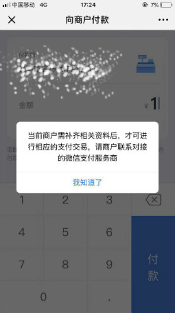 商户号没有实名认证,则无法发起微信支付,微信客户端会提示“当前商户需补齐相关资料后,才可进行相应的支付交易,请商户联系对接的微信支付服务商”。<br />
