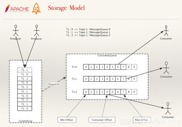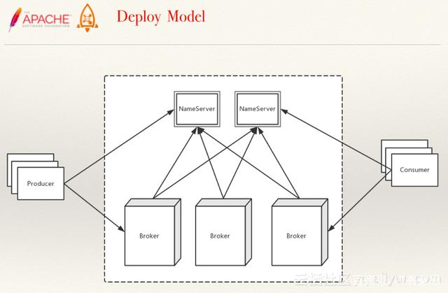 <br /><br /> 由这张图可以看到有四个集群,分别是 Name Server 集群、Broker 集群、Producer 集群和 Consumer 集群。<br /> 简单说明一下图中箭头含义,从 Broker 开始,Broker Master1 和 Broker Slave1 是主从结构,它们之间会进行数据同步,即 Date Sync。同时每个 Broker 与 Name Server 集群中的所有节点建立长连接,定时注册 Topic 信息到所有 Name Server 中。<br /> 生产者与 Name Server 集群中的其中一个节点(随机选择)建立长连接,定期从 Name Server 获取 Topic 路由信息,并向提供 Topic 服务的 Broker Master 建立长连接,且定时向 Broker Master 发送心跳。<br /> 消费者也是与 Name Server 集群中的其中一个节点(随机选择)建立长连接,定期从 Name Server 获取 Topic 路由信息。但是消费者与生产者不同,生产者只能将消息发送到 Broker master,消费者则可以同时和提供 Topic 服务的 Broker Master 和 Broker Slave 建立长连接,既可以从 Broker Master 订阅消息,也可以从 Broker Slave 订阅消息。<br /> <br /> <br />**Rocketmq 的概念模型**<br /> <br />入门一项新技术,首先认识它的核心概念。<br /> <br /> <br /><br /> 这三者是 RocketMq 中最最基本的概念。Producer 是消息的生产者。Consumer 是消息的消费者。消息通过 Topic 进行传递。Topic 存放的是消息的逻辑地址。<br /> 具体来说是 Producer 将消息发往具体的 Topic。Consumer 订阅 Topic,主动拉取或被动接受消息。<br /> 实际上,Topic 还需要拆封出更多概念<br /> <br /><br /> 这张图里有两个生产者,ProducerA 和 ProducerB。定义了两个 Topic-TopicA 和 TopicB。ProducerA 会发送两种消息。<br /> 所以这里的知识点是一个 Producer 可以发中 Topic。<br /> TopicA 有 3 个 MessageQueue,MessageQueue 记录的是消息的物理存储地址(在 consumelog 里的位置),分布在两个 broker 上。Broker 是一个集群部署架构上的概念,可以理解为对应的物理机器。最右边是 ConsumerGroup,每一组下又有多个 Consumer,实际上也就是启动的用来消费的 JVM。一个 Consumer 可以订阅多个不同的 Topic。这里我有话要说,虽然从代码层面上支持这种订阅。但是强烈不建议一个 Consumer 订阅多个不同的 Topic。推荐用法是一组 ConsumerGroup 只订阅一种 Topic。<br /> 另外多组 ConsumerGroup 之间,对于同一个 Topic 是广播订阅的。(翻译一下就是说:Topic 的一条消息会广播给所有订阅的 ConsumerGroup,就是每个 ConsumerGroup 都会收到),但是在一个 ConsumerGroup 内部给个 Consumer 是负载消费消息的,(翻译一下就是:一条消息在一个 group 内只会被一个 Consumer 消费)<br />**存储模型**<br />下面看看 Rocketmq 的消息实际是怎么存储的?<br /> <br /><br /> 左边的是 CommitLog。这个是真正存储消息的地方。可以看出 RocketMQ 所有生产者的消息都是往这一个地方存的。<br /> 右边是 ConsumeQueue。这是一个逻辑队列。和上文中 Topic 下的 messageQueue 是一一对应的。消费者是直接和 ConsumeQueue 打交道。ConsumeQueue 记录了消费位点,这个消费位点关联了 commitlog 的位置。所以即使 ConsumeQueue 出问题,只要 commitlog 还在,消息就没丢,可以恢复出来。还可以通过修改消费位点来重放或跳过一些消息。<br />**部署模型 **<br /> <br /><br /> 在部署 RocketMQ 时,会部署两种角色。NameServer 和 Broker。NameServer 主要做路由服务。生产者发送消息时,首先向 NameServer 拿到 Topic 的路由信息,即这个 Topic 在哪些 Broker 上有。Consumer 也是一样,需要知道消费队列的路由情况。当然不是每次收发消息都去 NameServer 查询一遍,简单的说只有第一次初始化,和以后发送或这首出现问题时需要查询一下。<br /> Broker 一般我们会部署主备两个节点。<br /> RocketMq 没有选举,broker 的角色是在部署时就人工确定好的。如果主挂了,备不会自动切换为主。<br /> 对于一个 2 主 2 备的集群来说,如果挂了一个主,是没有问题的。只要另一个主上你之前也创建了 Topic,那么发送的消息流量会导流到存活的主节点上,业务代码端是无影响的。