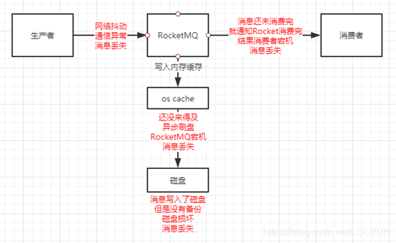 - 消息存储在 pagecache 区,且尚未触发异步刷盘,而出现断电一类,导致数据丢失。或是存入磁盘后,磁盘损坏导致数据丢失