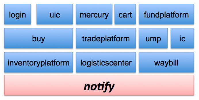 先说集团最早的消息中间件notify,notify诞生于2007年,是伴随着淘宝交易系统进入分布式时代产生的。主要用于核心交易链路的异步解耦,以缩短了下单流程的RT,提高了电商业务的扩展能力。目前电商核心业务领域对象包括收藏夹、购物车、订单、用户、商品、物流单、资金的状态变更都会产生notify消息,很多电商下游和周边系统都可以通过订阅这些消息来透明的构建围绕自身的特色业务。以下是notify支撑的核心交易业务图,可以认为notify百分之90以上的消息都是来自交易相关业务。<br /><br />notify在设计之时,消息中间件规范JMS及AMQP已经发布,notify的很多领域对象都是参考这两大规范。