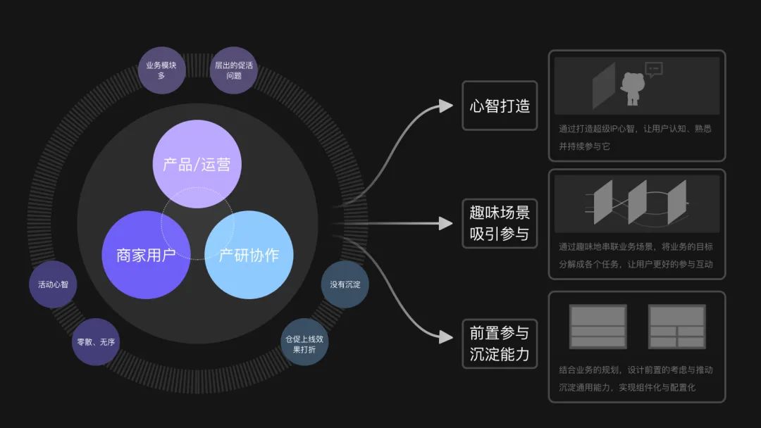 基于以上三个背景,针对用户、业务、协同三个方面提出系统的解决方案,制定设计策略: