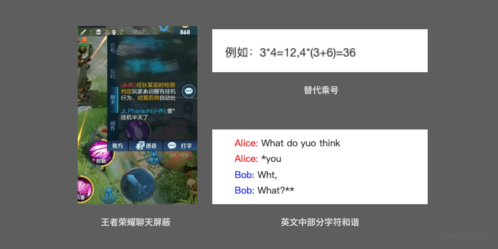 - 在某些具有社交属性的平台上(论坛、游戏内对话等),“*”常被用来替代被“和谐”的字眼。