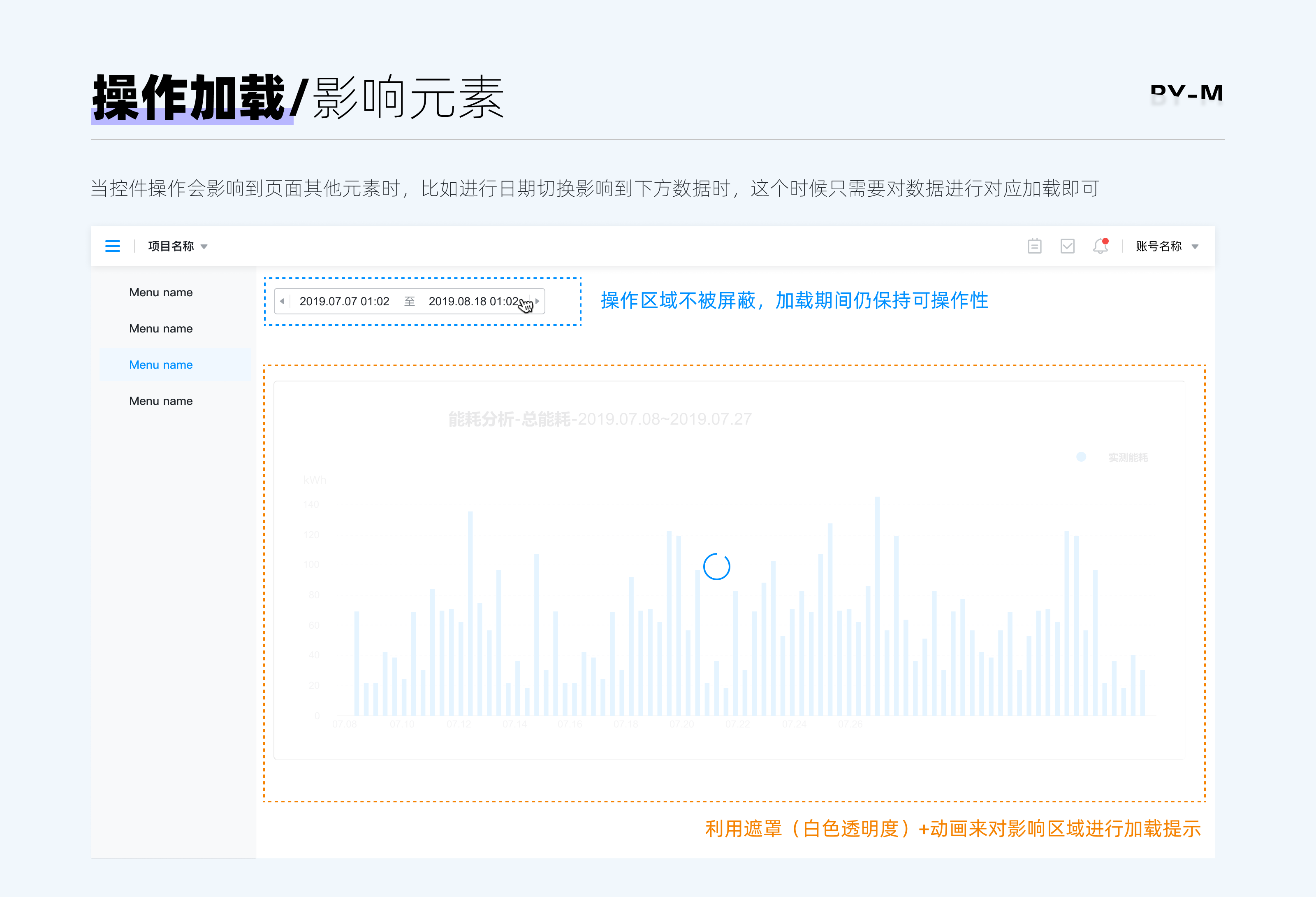 需要注意的是如果在产品中使用方案1,我们的遮罩区域只需要覆盖被影响的元素就可以了(保存这种可以将按钮一起覆盖),比如通过筛选导致图表数据发生变化,这时只需覆盖图表区域,而不用覆盖筛选区域。这样的好处是当某些筛选数据出现加载过慢问题时,用户可以通过切换筛选项来打断当前加载。
