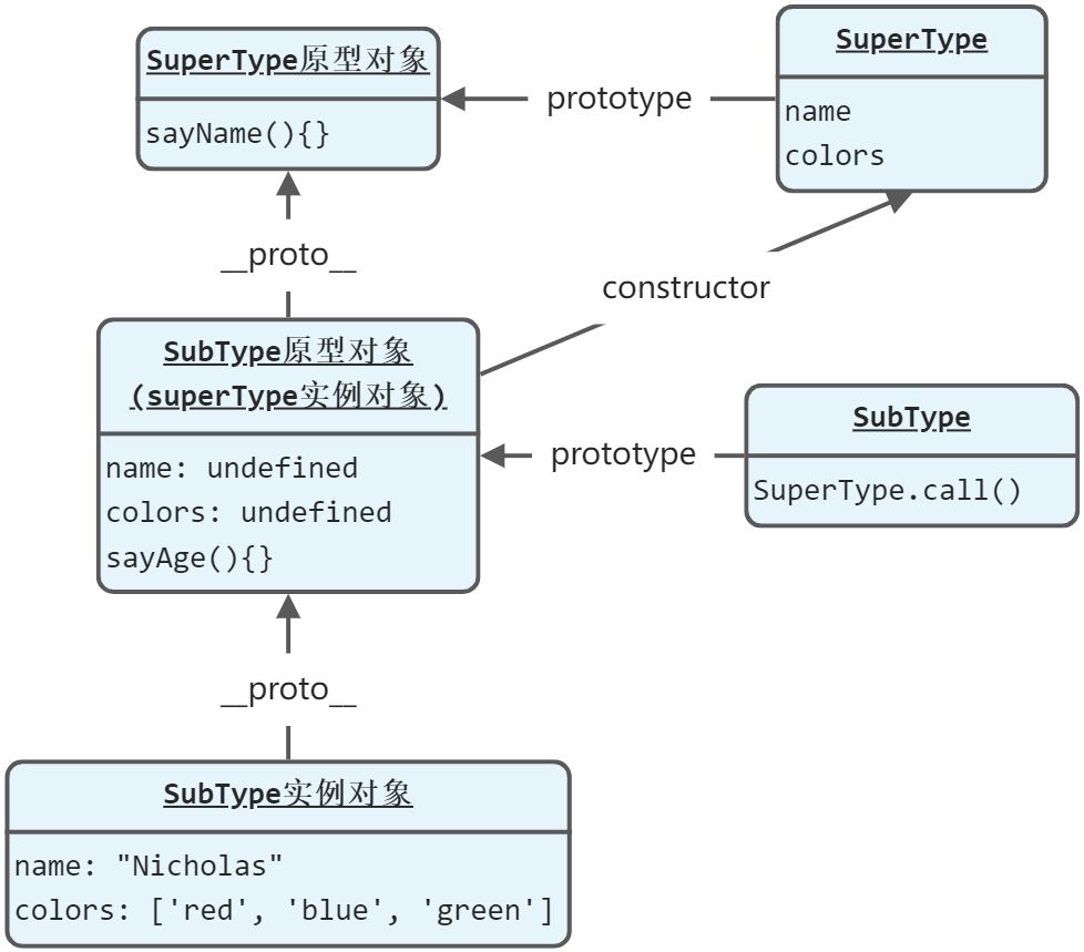 function object(o){function F(){}F.prototype = oreturn new F();}function inheritProperty(SubType, SuperType){let prototype = object(SuperType.prototype)prototype.constructor = SubTypeSubType.prototype = prototype}function SuperType(name) {this.name = namethis.colors = ['red', 'blue', 'green']}function SubType(name, age) {SuperType.call(this, name)this.age = age}inheritProperty(SubType, SuperType)SuperType.prototype.sayName = function() {console.log(this.name);}SubType.prototype.sayAge = function() {console.log(this.age);}let instance = new SubType("Nicholas", 29)