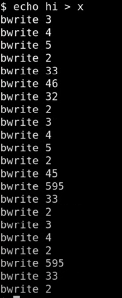 我已经在bwrite函数中加了一个print语句。bwrite函数是block cache中实际写磁盘的函数,所以我们将会看到实际写磁盘的记录。在上节课(Lec 14)我将print语句放在了log_write中,log_write只能代表文件系统操作的记录,并不能代表实际写磁盘的记录。我们这里会像上节课一样执行echo “hi” > x,并看一下实际的写磁盘过程。