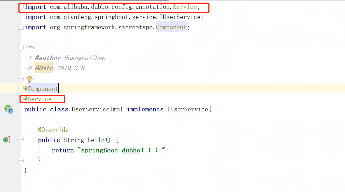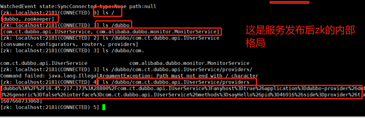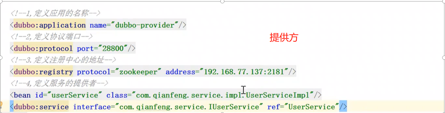 Springboot+dubbo<br />环境的搭建:<br />1.安装zookeeper+jdk:到相关笔记中去找<br />2.安装dubbo-monitor+tomcat:到相关笔中找<br />3.将dubbo-admin.war解压放入到tomcat的root目录下<br />注意:1.先清空root目录:rm -rf *<br />解压dubbo-admin.war使用unzip命令:unzip dubbo-admin.war -d /ROOT<br />4.在解压的路径的WEB-INF目录下有一个配置文件:dubbo.properties:配置注册中心<br /><br />5.页面访问验证:ip:port 这里就直接替换了tomcat的首页效果展示<br /><br /> <br />2. springboot整合dubbo //这里是基于注解实现<br />1. 创建一个springboot项目<br />2. 添加dubbo的依赖以及注册中心的依赖:<br /><br />3. 配置文件:<br /><br />下面这个是基于xml配置文件的格式:可以作为一个对比<br /><br /><br />4. 在启动类中开启dubbo的支持:<br /><br />5. 服务的发布:<br /><br />6. 服务的调用:<br /><br />注意:当我们将服务进行暴露并转叫给zk进行存储的时候,zk的内部结构是什么样子的<br /><br />转换一下:<br /><br /> <br />注意:这里dubbo的集群服务的注册,只需要更改对外服务端口,也就是28800那个东东。