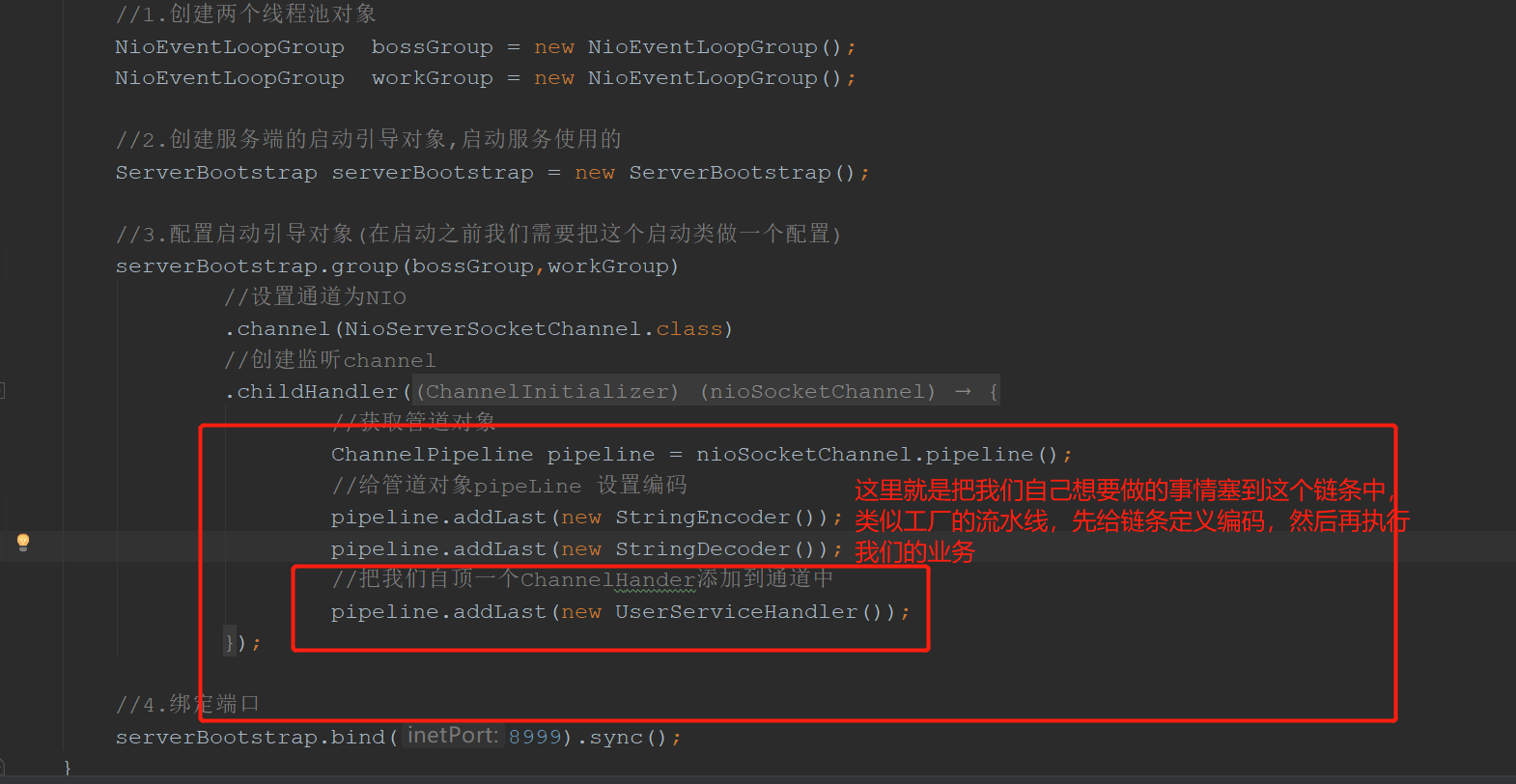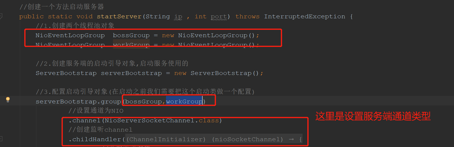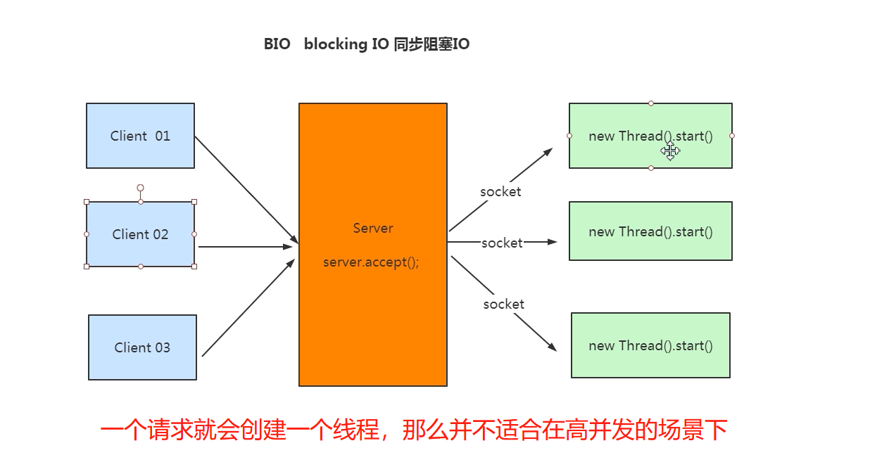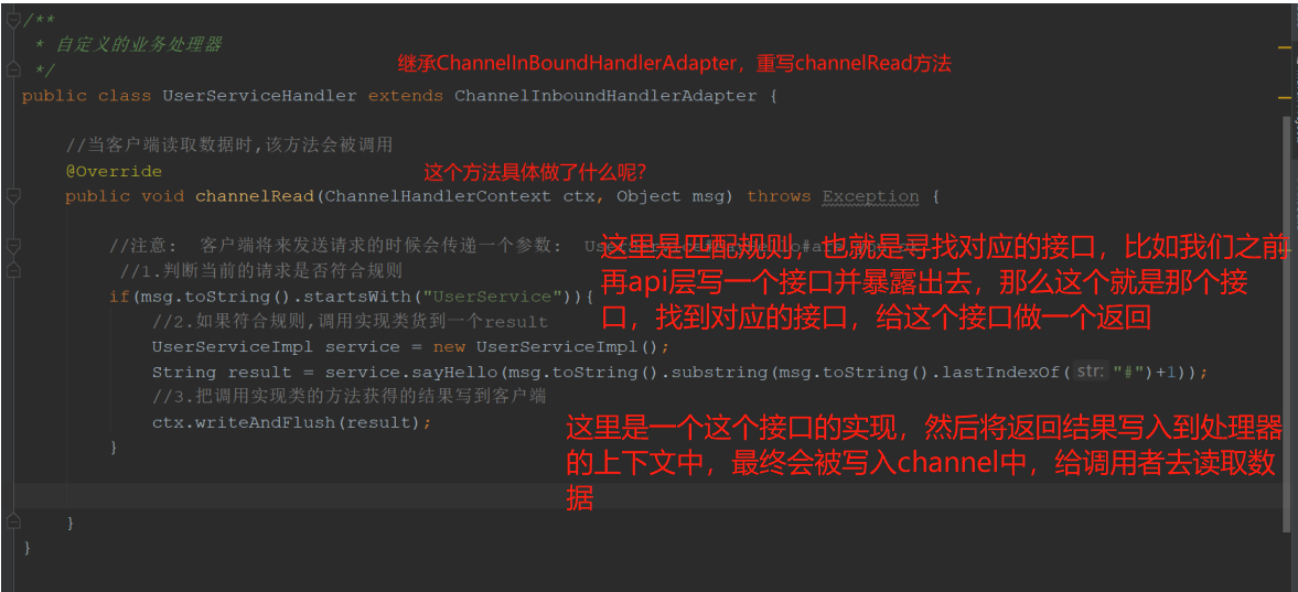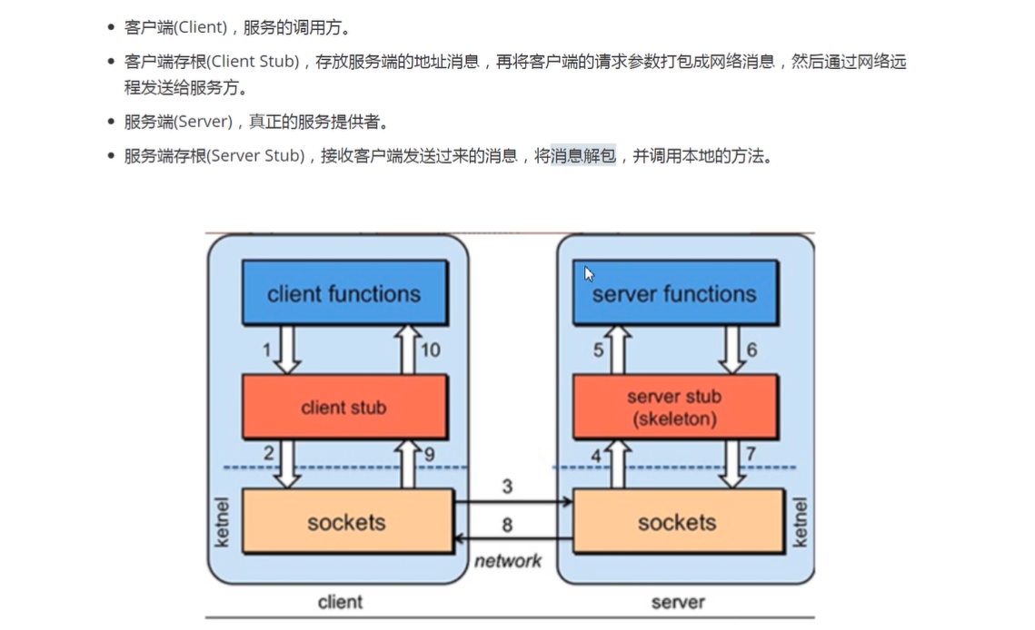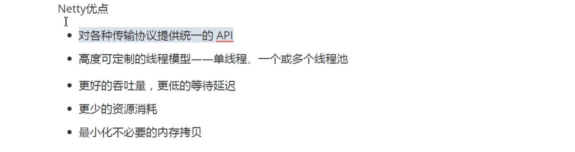 网络通信<br />1.网络传输的要素:<br />1. 协议;<br />Udp:广播协议,面向无连接的,速度快,不安全<br />Tcp:面向连接的,因为要经过三次握手,所以比较慢,比较安全<br /> <br />注意:udp和tcp都是基于socket来实现的协议<br /> <br />2.io:网络间的数据传输是通过二进制数据进行传输的,那么也就是使用io流的形式进行传输的<br /> <br />注意:IO的分类<br />1. BIO:同步阻塞io<br />2. AIO:异步非阻塞io<br />3. NIO:同步非阻塞io<br /> <br />注意:这里的同步和异步指的是应用程序和内核的交互:<br /> 同步:排队等待,<br /> 异步:无需等待<br />阻塞:指未得到当前消息就直接挂起不做其他事情<br />非阻塞:即使未得到结果,先去做其他事情了<br /> <br /> <br />3.RPC框架以及原理:主要作用就是将消息进行打包封装以及解压<br /><br /><br /> <br /> <br />远程调用讲解:<br />1. RMI:java原生支持的远程调用,不需要依赖第三方的包,使用的是jrmp协议<br /> <br /> <br />BIO:同步阻塞的io<br /><br />代码案例:<br />服务端:<br /><br />客户端:<br /><br /> <br />NIO:同步非阻塞io:一个请求开辟一个通道<br /><br />1. 客户端的请求注册到多路复用器上面,注册到上面之后,多路复用器就去轮询我们的服务器,看客户端需要执行的对应的哪些读操做和写操做,然后开辟一个通道(channel),多路复用器并监控io的读写请求<br />2. 数据主要是buffer(缓冲区)和channel(通道)之间的交互<br />3. 这里始终使用的是一个线程进行连接<br /> <br /> <br />代码案例:<br /> <br /> <br />NIO缺点:<br />1. 类库和api繁杂,使用麻烦<br />2. 可靠性不强<br />3. Nio的bug,列如epoll bug,会导致selector空轮询,以至于cpu100%<br /> <br />AIO:异步非阻塞:<br /><br />这里客户端将信息只要交给操做系统就好了,什么也不用管,到时候服务端会主动调用回调函数去进行通知<br /> <br />使用场景:连接数目多且比较长的连接,就用aio去实现:相册服务器<br /> <br />注意:**长连接**:客户端和服务端建立连接之后,一次请求之后不会立即关闭,而是保留连接方便下次使用:客户端消失但连接依然存在,比较占资源,这个时候服务端每2个小时发送一次探测报文段给客户端,获取客户端的状态。<br /> **短连接**:客户端和服务端建立连接之后,一次请求之后会立即关闭,一般由客户端发起关闭请求:管理起来简单,意味着存在的连接都是有用的连接<br /> <br /> <br />Netty:异步的,基于事件驱动的网络编程框架:支持socket,也支持http协议<br /><br /><br /> <br />Netty的线程模型:<br />1. 单线程模型:当并发比较高的情况下,单线程的处理效率会非常差<br />2. 线程池模型:<br /> <br />Netty常用组件:<br />1. ChannelHandler接口及其实现类:ChannelInBoundHandlerAdapter<br />使用说明:<br />1. 自定义一个类继承ChannelInBoundHandlerAdapter,并重写里面的相关方法去实现业务逻辑,<br /><br />代码案例:<br /><br /> <br /> 2.ChannelPipeline:Handler集合,负责处理和拦截inbound或者outbound的事件和操做<br /> <br />注意:这里就好比是一条执行链条,在通道中,我们需要先做什么,再做什么,都往这个链条中塞,也就是使用下面的方法,至于first和last类似队列,有队头和队尾的概念<br /><br />代码案例:<br /><br /><br /> <br /> 3.ChannelHandlerContext:这个是每个通道中处理事件的具体工作者,是业务处理中的参数,从而获得对数据的操做:看第一个组件图可知<br /><br /> <br /> <br /> 4.ChannelFuture:channel异步IO操做的结果<br /><br /> <br />5.接口EventLoopGroup和其实现类:NioEventLoopGroup:<br /> 这个类似一个线程池,里面有很多的eventloop,每个eventloop负责维护一个selector。<br /> <br />注意:1.selector:多路复用器<br />2. 我们在消息的提供端(服务端)创建两个线程池,一个用来用户的连接,一个用来连接中数据的读写<br />3. 创建好之后作为参数放在启动助手类之中就好<br />代码案例:<br /><br />6. serverbootstrap和bootstrap<br /> Serverbootstrap是服务端启动助手:<br />Bootstrap:启动引导类<br />代码案例:<br /><br /> <br /> <br />常用组件就讲完了,回过头再仔细阅读代码 然后总结一套流程出来<br /> <br />Netty实战:<br />1. 引入依赖:<br /><br />2. <br />3. <br />4. <br /> <br />1. 服务端:<br />2. 客户端:<br /> <br /> <br />使用netty实现rpc框架原理与实战:<br /> <br /> <br />这个下面就全是代码了 代码我已经全部给你了,你自己总结流程就行了。