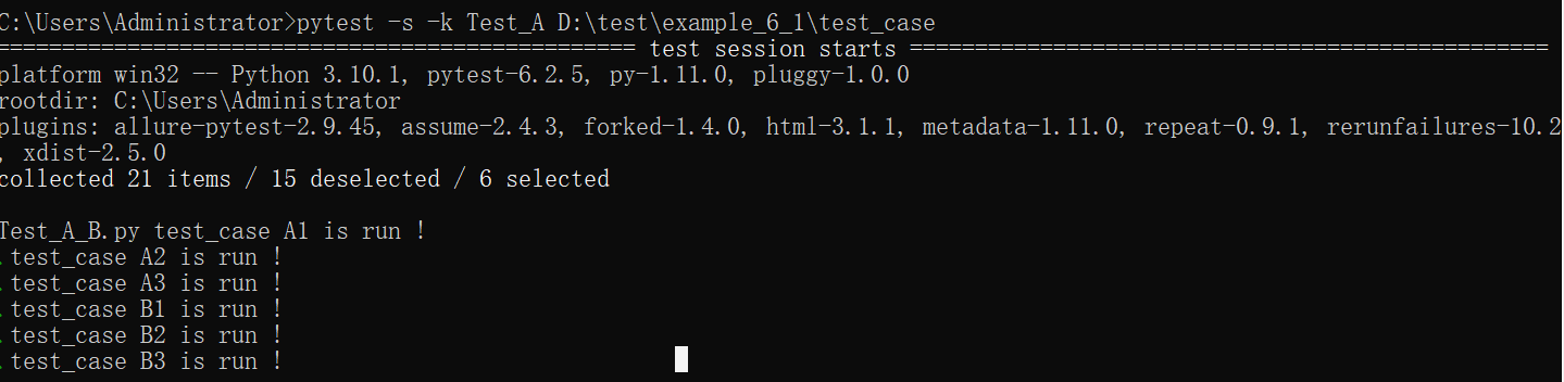 执行命令: pytest -s -k “not Test_A “ D:\test\example_6_1\test_case