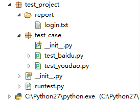 可以直接使用Python自带的单元测试框架unittest来编写自动化测试用例,利用其组织测试用例,断言预期结果,以及批量执行测试用例等功能,可以很好的进行Web自动化测试的开发。<br /> 可以直接查看我另外一篇博文总结:[unittest单元测试框架总结](http://www.cnblogs.com/yufeihlf/p/5707929.html)<br /> 里边详细总结了[使用unittest框架编写测试用例思路(模板)](http://www.cnblogs.com/yufeihlf/p/5707929.html#test2)**和**[使用unittest框架编写测试用例实例](http://www.cnblogs.com/yufeihlf/p/5707929.html#test3)**。**<br /> 目录结构如下组织:<br /><br />如上图:test_case目录下有两个测试用例,其中test_baidu.py实例代码在博文“unittest单元测试框架总结”中有贴出。其他实例,可以参考模板实现,就不全部贴出代码了。<br /> 而这次需要测试的就是test_baidu.py和test_youdao.py这两个测试用例。
