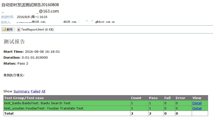 # coding=utf-8'''Created on 2016-7-26@author: JenniferProject:整合自动发邮件功能,执行测试用例生成最新测试报告,取最新的测试报告,发送最新测试报告问题,邮件始终不能显示html:将电脑时间改为北京时间即可'''import unittestfrom HTMLTestRunner import HTMLTestRunnerimport timeimport osimport smtplibfrom email.mime.text import MIMETextfrom email.mime.multipart import MIMEMultipartfrom email.header import Header#2.定义:取最新测试报告def new_file(test_dir):#列举test_dir目录下的所有文件,结果以列表形式返回。lists=os.listdir(test_dir)#sort按key的关键字进行排序,lambda的入参fn为lists列表的元素,获取文件的最后修改时间#最后对lists元素,按文件修改时间大小从小到大排序。lists.sort(key=lambda fn:os.path.getmtime(test_dir+'\\'+fn))#获取最新文件的绝对路径file_path=os.path.join(test_dir,lists[-1])# L=file_path.split('\\')# file_path='\\\\'.join(L)return file_path#3.定义:发送邮件,发送最新测试报告htmldef send_email(newfile):#打开文件f=open(newfile,'rb')#读取文件内容mail_body=f.read()#调试使用# print u'打印'# print mail_body#关闭文件f.close()#发送邮箱服务器smtpserver = 'smtp.163.com'#发送邮箱用户名/密码user = 'XXX@163.com'password='XXX'#发送邮箱sender='XXX@163.com'#多个接收邮箱,单个收件人的话,直接是receiver='XXX@126.com'receiver=['XXX@126.com','XXX@126.com','XXX@doov.com.cn']#发送邮件主题subject = '自动定时发送测试报告20160808'#编写 HTML类型的邮件正文#MIMEText这个效果和下方用MIMEMultipart效果是一致的,已通过。# msg = MIMEText(mail_body,'html','utf-8')msg=MIMEMultipart('mixed')#注意:由于msg_html在msg_plain后面,所以msg_html以附件的形式出现# text = "Dear all!\nThe attachment is new testreport.\nPlease check it."#中文测试ok# text = "Dear all!\n附件是最新的测试报告。\n麻烦下载下来看,用火狐浏览器打开查看。\n请知悉,谢谢。"# msg_plain = MIMEText(text,'plain', 'utf-8')# msg.attach(msg_plain)msg_html1 = MIMEText(mail_body,'html','utf-8')msg.attach(msg_html1)msg_html = MIMEText(mail_body,'html','utf-8')msg_html["Content-Disposition"] = 'attachment; filename="TestReport.html"'msg.attach(msg_html)#以附件的方式发送:但是会报554,倍163退信。--此路不通。# msg_html = MIMEText(mail_body,'base64','utf-8')# msg_html["Content-Type"] = 'application/octet-stream'# msg_html.add_header('Content-Disposition', 'attachment', filename='testreport.html')# msg.attach(msg_html)#要加上msg['From']这句话,否则会报554的错误。#要在163有限设置授权码(即客户端的密码),否则会报535msg['From'] = 'XXX@163.com <XXX@163.com>'# msg['To'] = 'XXX@doov.com.cn'#多个收件人msg['To'] = ";".join(receiver)msg['Subject']=Header(subject,'utf-8')#连接发送邮件smtp=smtplib.SMTP()smtp.connect(smtpserver,25)smtp.login(user, password)smtp.sendmail(sender, receiver, msg.as_string())smtp.quit()if __name__=='__main__':print '=====AutoTest Start======'#1.执行测试用例,生成最新的测试用例#指定测试用例为当前文件夹下的test_case目录#如果用/可以不用r# test_dir='./test_case'#Windows的cmd执行:python "D:\system files\workspace\selenium\test_project\runtest_htmltestrunner_autosendemail.py"#不用绝对路径会报:ImportError: Start directory is not importable: './test_case'test_dir = 'D:\\system files\\workspace\\selenium\\test_project\\test_case'#知道测试报告的路径test_report_dir='D:\\pythontest\\testresult'discover=unittest.defaultTestLoader.discover(test_dir, pattern='test_*.py')now=time.strftime('%Y-%m-%d_%H_%M_%S_')filename = test_report_dir+'\\'+ now + 'result.html'fp=open(filename ,'wb')#需屏蔽fp中的中文文字说明。否则在windows下执行会报:UnicodeDecodeError: 'ascii' codec can't decode byte 0xe7 in position 553: ordinal not in range(128)runner = HTMLTestRunner(stream=fp,title=u'测试报告',description=u'用例执行情况:')runner.run(discover)#注意:调用函数一定要加括号,一个括号害死个人,哎,查了几天的问题,才发现导致html文件始终显示空白,就是因为close函数调用不正确,漏了括号。fp.close()#2.取最新测试报告new_report=new_file(test_report_dir)#调试用的# print new_report#3.发送邮件,发送最新测试报告htmlsend_email(new_report)print '=====AutoTest Over======'