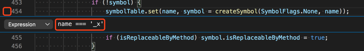 保持 declareSymbol 函数中 src/compiler/binder.ts#L454 位置的条件断点不变,