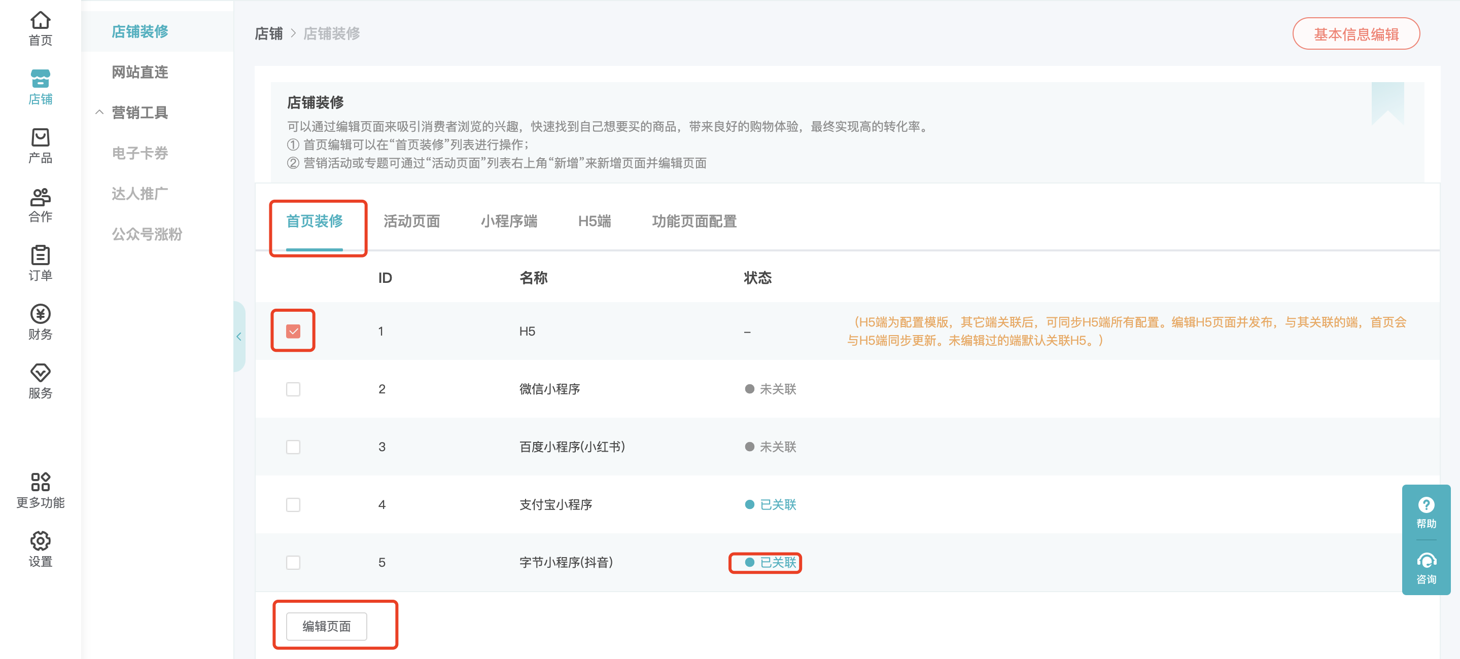 路径:店铺——店铺装修——管理——首页装修——编辑页面,若字节小程序(抖音)已关联H5,则选择H5即可,若未关联,选择字节小程序(抖音)<br /><br />首页banner页添加活动页面跳转(链接为复制活动页面的H5链接和小程序链接)——模块保存——页面保存——发布(此操作是为了进入小程序后快速定位到直播产品)<br />