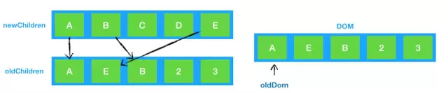 <a name="kesAy"></a>### `diffChildren`先从最简单的开始, 上面已经猜出 `diffChildren` 用于比对两个 VNode 列表.<br />如上图, 首先这里需要维护一个表示当前插入位置的变量 oldDOM, 它一开始指向 DOM childrenNode 的第一个元素, 后面每次插入更新或插入 newDOM,都会指向 newDOM 的下一个兄弟元素.<br />在遍历 newChildren 列表过程中,会尝试找出相同 key 的旧 VNode,和它进行 diff。如果新 VNode 和旧 VNode 位置不一样,这就需要移动它们;对于新增的 DOM,如果插入位置(oldDOM)已经到了结尾,则直接追加到父节点, 否则插入到 oldDOM 之前。<br />最后卸载旧 VNode 列表中未使用的 VNode.<br />来详细看看源码:```javascriptexportfunctiondiffChildren(parentDom, // children的父DOM元素newParentVNode, // children的新父VNodeoldParentVNode, // children的旧父VNode,diffChildren主要比对这两个Vnode的childrenmounts, // 保存在这次比对过程中被挂载的组件实例,在比对后,会触发这些组件的componentDidMount生命周期函数ancestorComponent, // children的直接父'组件', 即渲染(render)VNode的组件实例oldDom, // 当前挂载的DOM,对于diffChildren来说,oldDom一开始指向第一个子节点) {let newChildren = newParentVNode._children || toChildArray(newParentVNode.props.children, (newParentVNode._children = []), coerceToVNode, true,);let oldChildren = (oldParentVNode && oldParentVNode._children) || EMPTY_ARR;// ...// ⚛️遍历新childrenfor (i = 0; i < newChildren.length; i++) {childVNode = newChildren[i] = coerceToVNode(newChildren[i]); // 规范化VNodeif (childVNode == null) continue// ⚛️查找oldChildren中是否有对应的元素,如果找到则通过设置为undefined,从oldChildren中移除// 如果没有找到则保持为nulloldVNode = oldChildren[i];for (j = 0; j < oldChildrenLength; j++) {oldVNode = oldChildren[j];if (oldVNode && childVNode.key == oldVNode.key && childVNode.type === oldVNode.type) {oldChildren[j] = undefined;break;}oldVNode = null; // 没有找到任何旧node,表示是一个新的}// ⚛️ 递归比对VNodenewDom = diff(parentDom, childVNode, oldVNode, mounts, ancestorComponent, null, oldDom);// vnode没有被diff卸载掉if (newDom != null) {if (childVNode._lastDomChild != null) {// ⚛️当前VNode是Fragment类型// 只有Fragment或组件返回Fragment的Vnode会有非null的_lastDomChild, 从Fragment的结尾的DOM树开始比对:// <A> <A>// <> <> 👈 Fragment类型,diff会递归比对它的children,所以最后我们只需要将newDom指向比对后的最后一个子节点即可// <a>a</a> <- diff -> <b>b</b>// <b>b</b> <a>a</a> ----+// </> </> \// <div>x</div> 👈oldDom会指向这里// </A> </A>newDom = childVNode._lastDomChild;} elseif (oldVNode == null || newDom != oldDom || newDom.parentNode == null) {// ⚛️ newDom和当前oldDom不匹配,尝试新增或修改位置outer: if (oldDom == null || oldDom.parentNode !== parentDom) {// ⚛️oldDom指向了结尾, 即后面没有更多元素了,直接插入即可; 首次渲染一般会调用到这里parentDom.appendChild(newDom);} else {// 这里是一个优化措施,去掉也不会影响正常程序. 为了便于理解可以忽略这段代码// 尝试向后查找oldChildLength/2个元素,如果找到则不需要调用insertBefore. 这段代码可以减少insertBefore的调用频率for (sibDom = oldDom, j = 0; (sibDom = sibDom.nextSibling) && j < oldChildrenLength; j += 2) {if (sibDom == newDom)break outer;}// ⚛️insertBefore() 将newDom移动到oldDom之前parentDom.insertBefore(newDom, oldDom);}}// ⚛️其他情况,newDom === oldDOM不需要处理// ⚛️ oldDom指向下一个DOM节点oldDom = newDom.nextSibling;}}// ⚛️ 卸载掉没有被置为undefined的元素for (i = oldChildrenLength; i--; )if (oldChildren[i] != null) unmount(oldChildren[i], ancestorComponent);}