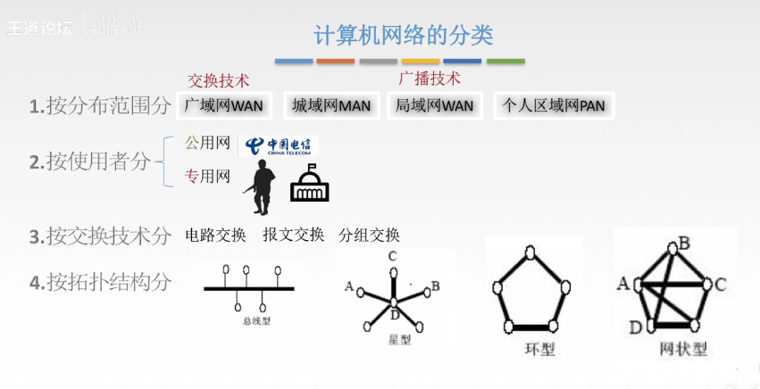 按分布范围:广域网Wide Area Network,WAN(交换技术)、城域网Metropolitan Area Network,MAN、局域网Local Area Network,LAN(广播技术)、个人区域网Personal Area Network,PAN