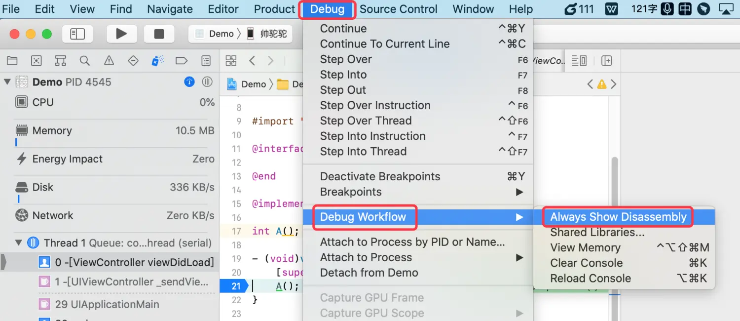 viewDidLoad方法调用A函数时设置断点,使用真机运行项目