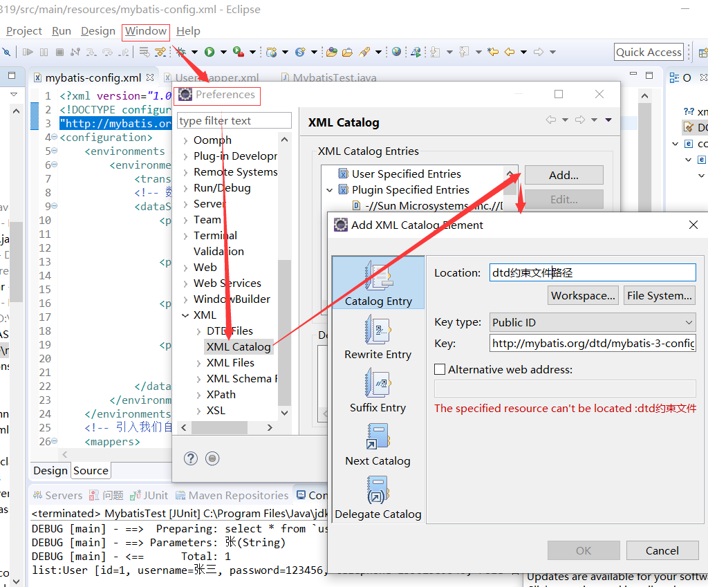 2)、绑定约束文件的位置1)、复制dtd约束文件网址"[http://mybatis.org/dtd/mybatis-3-config.dtd](http://mybatis.org/dtd/mybatis-3-config.dtd)"<br />