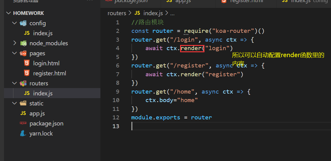 为了让路由直接跳到显示页面(render)