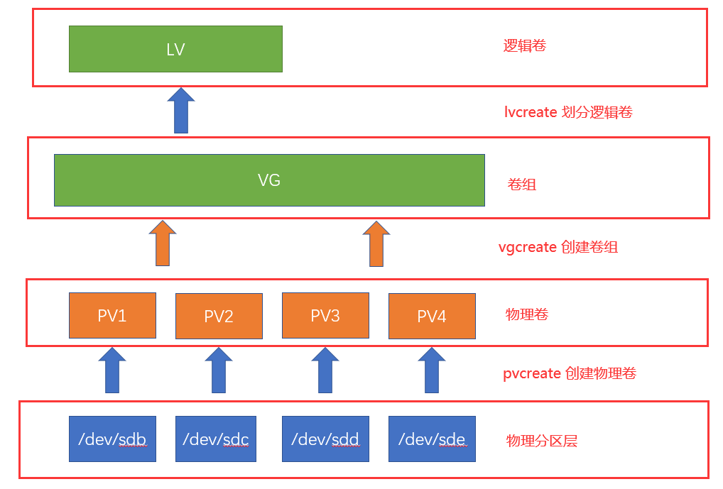 | 显示 | pvdisplay、pvs | vgdisplay、vgs | lvdisplay、lvs |
