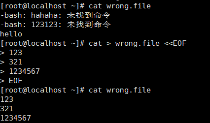 [root@localhost ~]# hahaha > right.file 2> wrong.file [root@localhost ~]# cat right.file [root@localhost ~]# cat wrong.file -bash: hahaha: 未找到命令