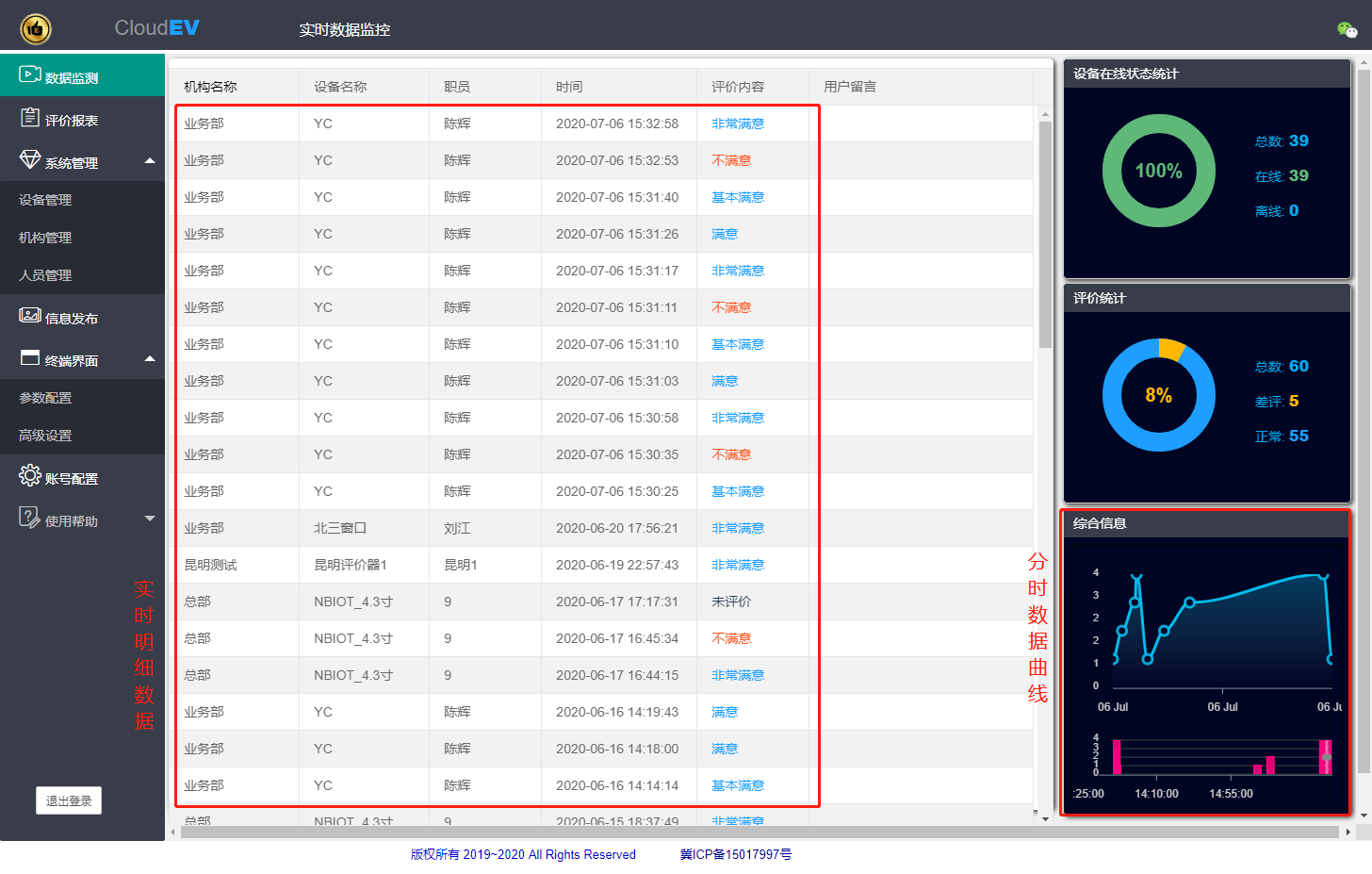 登录评价系统管理后台,点击左侧“数据监测”菜单,可查看实时数据,刷新页面可获得最新数据。<br />实时数据仅显示最近60条,点击浏览器刷新按钮,可查看最新评价数据。<br /><br />右下角窗口为最近24小时数据密度图。<br />实时数据是按设备所属部门显示的,因此在调整了设备部门的情况下,实时数据与部门明细可能有所不同,属正常现象。