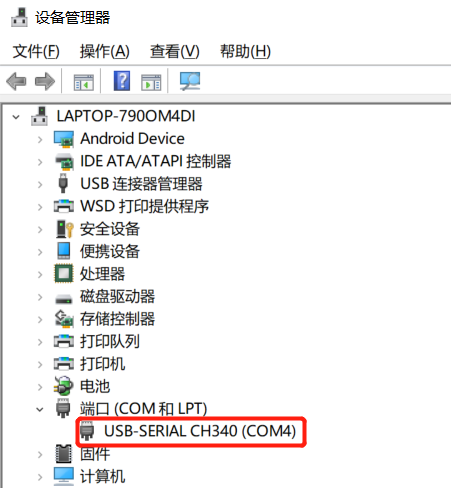 通过下面的链接下载CH340USB串口驱动下载链接<br /> [CH341串口驱动](https://apk87003.cdn.bcebos.com/CH341SER.rar)<br />[CH341SER驱动和win7补丁说明.rar](https://www.yuque.com/attachments/yuque/0/2021/rar/8411371/1635756518941-7b97c1c6-2516-4f22-af3c-7f0b32b2f341.rar?_lake_card=%7B%22src%22%3A%22https%3A%2F%2Fwww.yuque.com%2Fattachments%2Fyuque%2F0%2F2021%2Frar%2F8411371%2F1635756518941-7b97c1c6-2516-4f22-af3c-7f0b32b2f341.rar%22%2C%22name%22%3A%22CH341SER%E9%A9%B1%E5%8A%A8%E5%92%8Cwin7%E8%A1%A5%E4%B8%81%E8%AF%B4%E6%98%8E.rar%22%2C%22size%22%3A46582725%2C%22type%22%3A%22%22%2C%22ext%22%3A%22rar%22%2C%22source%22%3A%22transfer%22%2C%22status%22%3A%22done%22%2C%22mode%22%3A%22title%22%2C%22download%22%3Atrue%2C%22id%22%3A%22GsWGZ%22%2C%22card%22%3A%22file%22%7D)1)鼠标右击CH341SER.exe/CH340SER.exe,点击“以管理员方式运行”,选择驱动安装。<br /> 2)连接电脑的后部USB口,<br /> 3)设备加电,然后查看“设备管理器”->端口(COM和LPT)->中有CH340(COMx)设备,此时说明设备驱动和设备连接正常。<br /><br />安装完毕,在windows设备管理器出现CH340设备,说明驱动安装成功<br />