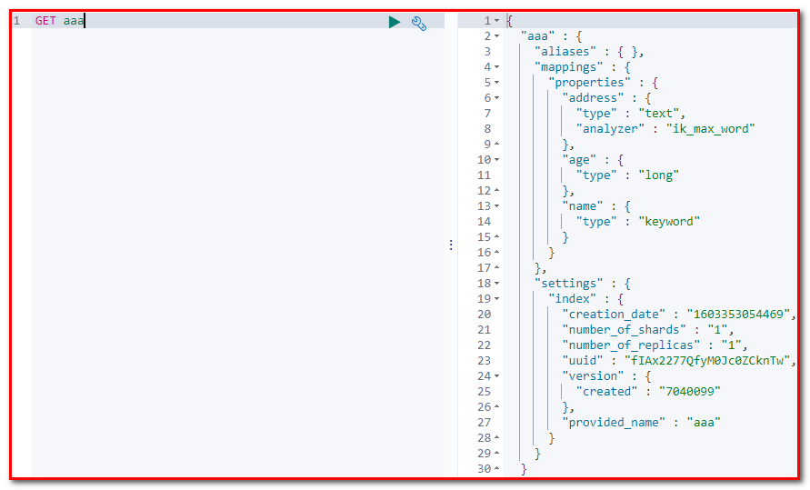 @Autowired<br /> **private** ElasticsearchRestTemplate elasticsearchTemplate;@Test<br /> **public** **void** **testCreate**() {<br /> // 创建索引,会根据Item类的@Document注解信息来创建<br /> elasticsearchTemplate.createIndex(Item.class);<br /> // 配置映射,会根据Item类中的id、Field等字段来自动完成映射<br /> elasticsearchTemplate.putMapping(Item.class);<br /> }<br />使用 kibana 查询<br />GET **item**