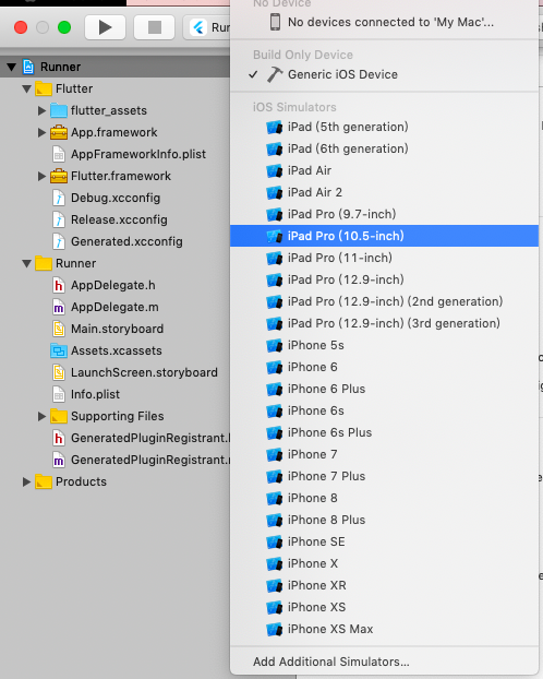open ios/Runner.xcworkspace打开默认的Xcode workspace.在Xcode中,选择导航面板左侧中的