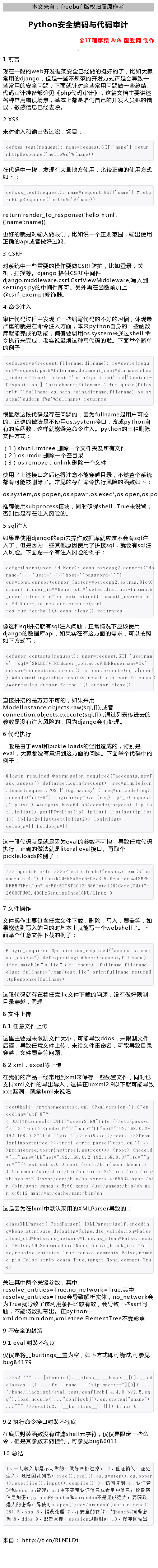 《Python安全编码与代码审计》现在一般的web开发框架安全已经做的挺好的了,比如大家常用的django,但是一些不规范的开发方式还是会导致一些常用的安全问题,下面就针对这些常用问题做一些总结。http://t.cn/RLm9ORj(来自: freebuf )