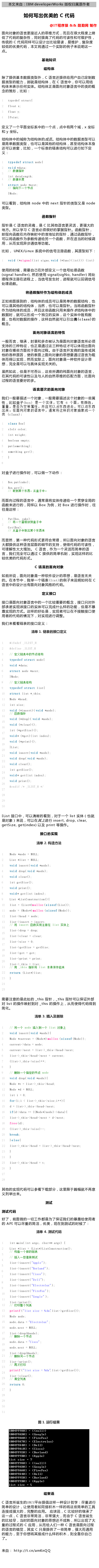 ![计算机生成了可选文字: 本 文 来 自 : [BMdevelo rworks 版 权 归 届 原 作 者 如 何 写 出 优 美 的 c 代 码 @仃 程 厚 猿 & & 酷 勤 网 制 作 面 向 对 象 的 语 言 更 接 近 人 的 思 维 方 式 , 而 且 在 很 大 程 度 上 降 低 了 代 码 的 复 杂 性 , 同 时 提 高 了 代 码 的 可 读 性 和 可 维 沪 性 传 统 的 c 代 码 同 样 可 以 设 计 出 比 较 易 读 , 易 维 沪 , 复 杂 度 较 低 的 优 美 代 码 , 本 文 将 通 过 一 个 实 际 的 例 子 来 说 明 这 一 点 。 基 础 知 识 结 构 体 除 了 提 供 基 本 数 据 类 型 外 , c 语 言 还 提 供 给 户 自 己 定 制 数 据 类 型 的 能 力 , 那 就 是 结 构 体 , 在 c 语 言 中 , 你 可 以 结 构 体 来 表 亍 任 何 实 体 。 结 构 体 正 是 面 向 对 象 语 言 中 的 类 的 概 念 的 推 形 , 比 如 typedef structI 口 0 a t x; float y , 丨 P 0 i n t , 定 义 了 一 个 平 面 坐 标 系 中 的 一 个 点 , 点 中 有 叻 个 域 , x 坐 和 y 坐 。 结 构 体 中 的 域 称 为 结 构 体 的 成 员 。 结 构 体 中 的 数 据 类 型 可 以 是 简 单 数 据 类 型 , 也 可 以 是 其 他 的 结 构 体 , 县 至 结 构 体 本 身 还 可 以 嵌 套 , 比 如 一 个 标 准 的 链 表 结 构 可 以 进 行 如 下 定 t y p e d e f s t r u c t no d e { void data 訕 指 针 int datal-ength Struct node _next 指 下 一 个 节 点 lNode 可 以 看 到 , 纟 士 构 体 node 中 的 next 俨 针 的 类 型 又 是 node 函 數 指 针 指 针 是 c 语 言 的 灵 谀 , 是 c 比 其 他 语 言 更 灵 活 , 更 强 大 的 地 方 。 所 以 学 习 c 语 言 必 须 很 好 的 皇 握 指 针 。 函 数 指 针 即 指 向 函 数 在 内 存 映 射 中 的 苜 地 址 的 指 针 , 通 过 函 数 指 针 可 以 将 函 数 作 为 参 数 传 递 给 另 一 个 函 数 , 并 在 适 当 的 时 佞 调 , 从 而 实 觋 异 步 通 信 等 功 能 。 比 如 , UN[X/Linux 系 统 中 的 信 号 注 册 函 数 , 其 原 型 如 下 . v 0 i d ( s i g n a 1 0 n t s i no , v 0 i d ( fun 的 ( i n 0 的 0 n 0 使 的 时 佞 , 需 要 己 在 外 部 定 义 一 个 信 号 处 理 函 数 (signal handler), 然 后 使 Signal(sigNo, handler) 将 处 理 程 序 注 册 在 进 程 上 , 当 信 号 发 生 时 , 进 程 就 可 以 回 调 信 号 处 理 函 数 。 将 函 數 指 针 作 为 结 构 体 的 成 员 正 如 前 面 提 到 的 , 结 构 体 的 成 员 可 以 是 简 单 的 数 据 结 构 , 也 可 以 是 其 他 的 结 构 体 , 当 然 , 也 可 以 是 指 针 。 当 将 函 数 指 针 作 为 结 构 体 的 成 员 , 并 且 这 些 函 数 R 来 操 作 . 在 士 构 体 中 的 数 据 时 , 可 以 十 成 一 个 伸 立 的 实 体 , 这 个 实 体 中 既 有 数 据 , 也 有 对 数 据 的 操 作 , 这 样 然 就 可 以 引 出 类 ( class ) 的 面 向 对 象 语 言 的 特 性 一 般 而 言 , 继 承 , 装 和 多 态 被 认 为 是 面 向 对 象 语 言 所 必 须 支 時 的 三 种 特 征 , 也 正 是 通 过 这 三 种 特 征 才 可 以 体 觋 出 面 向 对 象 在 哪 些 方 面 优 于 面 向 过 程 由 于 语 言 开 发 商 的 宣 传 或 其 他 的 各 种 原 因 , 使 的 表 面 上 面 向 对 象 的 思 想 要 通 过 语 言 为 载 体 而 得 以 实 觋 , 然 而 实 际 上 , 面 向 对 象 是 一 种 软 件 设 计 思 想 完 全 是 可 以 与 具 体 实 现 无 关 的 。 虽 然 如 此 , 但 是 不 可 否 认 , 这 些 所 诓 的 纯 面 向 对 象 的 语 言 在 其 代 码 的 可 读 性 以 及 与 人 的 然 思 维 的 匹 配 方 面 , 比 面 向 过 程 的 语 言 要 好 的 多 。 语 言 层 次 的 面 向 对 象 我 们 一 般 要 描 述 一 个 对 象 , 一 般 需 要 描 述 这 个 对 象 的 一 些 届 性 , 比 如 盒 子 ( b 。 x ) 罡 一 个 实 体 , 它 有 6 个 面 , 有 色 , 重 量 , 罡 否 为 仝 等 性 , 且 可 以 成 东 西 进 去 , 可 以 东 西 出 来 。 在 面 向 对 象 的 语 言 中 , 通 常 将 这 样 的 对 象 抽 象 成 一 个 (class) c I a s s 0 戛 { c 10 [ r co 1 0 r [ n t 可 e i h t , boolean empty, put(something) , S 0111 e t h i n e t 0 对 盒 子 进 行 操 作 时 可 以 做 一 下 动 作 Bo 戛 put(cake) Poo 戛 e t 0 , 取 到 某 个 东 西 , 从 点 子 中 。 而 面 向 过 程 的 语 言 中 , 通 常 是 将 实 体 传 递 给 一 个 贯 穿 全 局 的 函 数 来 进 行 的 , 同 样 以 Box 为 例 , 对 Box 进 行 操 作 时 , 往 往 是 这 样 put(Box, cake) 将 一 个 煮 子 中 Get(Box) , 从 煮 子 中 取 出 某 个 东 西 来 而 显 然 , 第 一 种 代 码 十 式 更 符 合 常 理 , 所 以 面 向 对 象 的 语 言 大 都 提 供 这 种 语 言 层 面 的 细 节 的 支 時 , 使 得 代 码 的 可 读 性 可 理 解 性 大 大 增 加 。 c 语 言 , 作 为 一 个 灵 活 而 简 单 的 语 , 我 们 完 全 可 以 通 过 c 提 供 的 简 单 机 制 , 实 觋 这 样 的 比 较 优 美 的 代 码 形 式 。 c 语 言 的 面 向 对 象 如 前 所 说 , 面 向 对 象 是 一 种 软 件 设 计 的 思 想 , 是 语 言 无 关 的 。 在 本 节 中 , 我 举 一 个 链 表 山 st ) 的 例 子 来 说 明 如 何 在 C 语 言 中 的 设 计 出 有 面 向 对 象 风 格 的 代 码 。 定 义 接 口 接 口 是 面 向 对 象 语 言 中 的 一 个 比 较 重 要 的 概 念 , 接 口 R 对 外 部 承 诺 实 觋 该 唼 口 的 实 体 可 以 完 成 什 么 样 的 功 能 , 但 是 不 暴 露 实 现 的 方 式 。 这 样 的 好 处 是 , 实 现 者 可 以 在 不 唼 触 接 口 使 者 的 代 码 的 情 兄 下 , 对 实 觋 进 行 调 整 。 我 们 来 看 看 链 表 的 接 口 定 义 清 单 1 . 链 表 的 接 口 定 义 # i d e [ 1 凵 S T H # d e 0 n