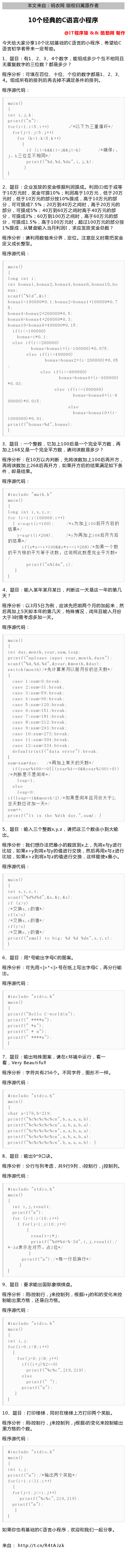【10个经典的C语言小程序】今天给大家分享10个比较基础的C语言的小程序,希望给C语言初学者带来一定帮助。http://t.cn/R4NKdSg(来自: 码农网)