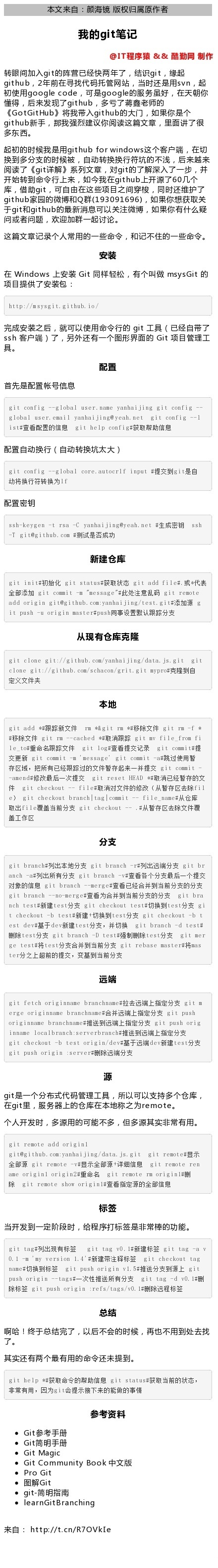 ![, GiRgit , github , , , code , (GotGitHub) , for , , fäbfigit , , EijiÉo Windows Git , http://msysgit. github. i o/ msysGit fi , git ( ssh 7 , Git ——global user. name yanhaijing g it config g it config global user. email yanhaijingyeah. net g it config g it help config ——global core. autocrlf input g it config ssh—keygen —t rsa —C yanhaijingyeah. net —T g i tog i thub. com g it add file . g it init g it status g it commit —m g it remote add origin gitgithub. com:yanhaijing/test. g it push —u origin master push g it clone git://gi thub. com/yanhaijing/data. js. g it g it clone git://gi thub. com/schacon/grit. g it mypro# g it add g it rm —f g it rm —cached g it mv file from fi le g it log* g it commit g it commit —m message’ g it commit g it commit —amend g it reset HEAD g it checkout - file g it checkout branchl tagl commit g it checkout file name g it branch* g it branch g it br anch g it branch g it branch ——merge# g it branch g it bra test5F nch test g it checkout test g it checkout —b t t checkout —b test est dev g it branch —d test* FJåff]Rtest5F g it branch —D test g it mer g it rebase mastermas ge test test g it fetch originname branchname# gitlll erg e originname g it push originname branchname# g it push orig inname local branch: serverbranch# g it checkout —b test origin/ dev g it push origin : server E-gitæ , g it remote add origin I gi tog i thub. com:yanhaijing/data. js. g it g it remote ame origin I origin2# g it remote g it remote show origin g it remoteff]- g it remote ren rm origin g it tag Y version L g it tag vO. g it tag —a v g it checkout tag g it push origin v 1.5 g it g it tag —d vO. push origin —tags# g it push origin : refs/ tags/vO. g it help g it status • GitifiÅÉ_Bh Git Magic Git Community Book Pro Git gi learnGitBranching . http://t.cn/R70Vke