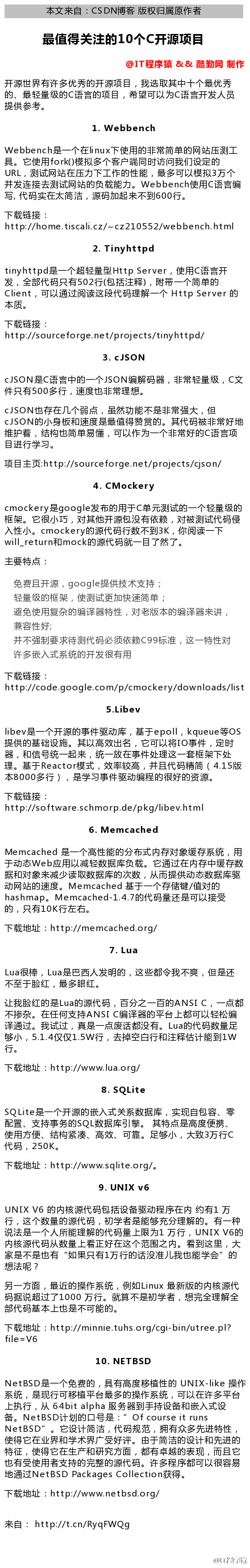 ![0 本 文 来 自 : CSDNtÜ 客 版 权 归 届 原 作 者 最 值 得 关 注 的 苋 0 个 C 开 源 顶 目 0 @仃 程 厚 猿 & & 酷 勤 网 制 作 开 源 世 界 有 许 多 优 秀 的 开 源 项 目 , 我 选 取 其 中 十 个 最 优 秀 的 、 最 轻 量 级 的 c 语 言 的 项 目 希 望 可 以 为 c 语 言 开 发 人 员 提 供 参 考 。 1 . W e b b e n ( h Webben ( h 是 一 个 在 linux 下 使 的 非 常 简 单 的 网 站 压 测 工 具 。 它 使 化 rk() 忄 莫 拟 多 个 客 F 端 同 时 访 问 我 们 设 定 的 URL , 测 试 网 站 在 压 力 下 工 作 的 性 能 , 最 多 可 以 忄 莫 拟 3 万 个 并 发 连 接 去 测 试 网 站 的 负 载 能 力 。 Webbench 使 语 言编 写 , 代 码 实 在 太 简 ; 吉 源 码 加 起 来 不 到 6 佣 行 。 下 载 链 接 http://home.tiscali.cz/—cz210552/webbench.html 2.Tinyhttpd tinyhttpdZ—个超轳量型 Http Server, 使 C 语 言 开 发 , 全 部 代 码 R 有 502 行 ( 包 括 注 释 ) , 附 带 一 个 简 单 的 Client , 可 以 通 过 阅 读 这 段 代 码 理 解 一 个 Http Server 的 本 质 。 下 载 链 接 http://sourceforge.net/projects/tinyhttpd/ 3 . ( J S O N cJSON 是 c 语 言 中 的 一 个 」 SON 编 解 码 器 , 非 常 轻 量 级 , c 文 件 R 有 5 佣 多 行 , 速 度 也 非 常 理 想 。 cJSON 也 存 在 几 个 弱 点 , 虽 然 功 能 不 是 非 常 强 大 , 但 ( 」 SON 的 小 身 板 和 速 度 是 最 值 得 由 的 。 其 代 码 被 非 常 好 地 维 沪 着 , 结 构 也 简 单 易 懂 , 可 以 作 为 一 个 非 常 好 的 c 语 言 项 目 进 行 学 习 。 项 目 芏 页 :http://sourceforge.net/projects/cjson/ 4.CMockery ( m 。 ( kery 是 g 。 。 g ] e 发 布 的 于 C 单 元 测 试 的 一 个 轻 量 级 的 框 架 。 它 很 小 巧 , 对 其 他 开 源 包 没 有 依 赖 , 对 被 测 试 代 码 侵 入 性 小 。 ( m 。 ( kery 的 源 代 码 行 数 不 到 3K , 你 阅 读 一 下 will_return 和 mock 的 源 代 码 就一 目 了 然 了 。 芏 要 特 点 免 费 且 开 源 , g 。 。 g ] e 提 供 技 术 支 恃 轻 量 级 的 框 架 , 使 测 试 更 加 快 速 简 单 擗 免 使 复 杂 的 编 译 器 特 性 , 对 老 版 本 的 编 译 器 来 讲 兼 容 性 好 , 并 不 强 制 要 求 待 测 代 码 必 须 依 赖 C99 标 准 , 这 一 特 性 对 许 多 嵌 入 式 系 统 的 开 发 很 有 下 载 链 接 http://code.google.com/p/cmockery/downloads/list 5.Libev 是 一 《 开 源 的 事 件 驱 动 库 , 基 于 ep 引 0 kqueue 等 OS libev 提 供 的 基 础 设 施 。 其 以 高 效 出 名 , 它 可 以 将 ℃ 事 件 , 定 时 器 , 和 信 号 统 一 起 来 , 统 一 放 在 事 件 处 理 这 一 套 框 架 下 处 理 。 基 于 Reactort 莫 式 , 效 率 较 高 , 并 且 代 码 精 简 ( 4 、 15 版 本 8 佣 0 多 行 ) , 是 学 习 事 件 驱 动 编 程 的 很 好 的 资 源 。 下 载 链 接 http://software.schmorp 、 de/pkg/libev.html 6 . Memcached Me mcached 是 一 个 高 性 能 的 分 布 式 内 存 对 象 缓 存 系 统 , 于 动 态 web 应 以 减 轻 数 据 库 负 载 。 它 通 过 在 内 存 中 缓 存 数 据 和 对 象 来 减 少 读 取 数 据 库 的 次 数 , 从 而 提 供 动 态 数 据 库 驱 动 网 站 的 速 度 。 Memcached 基 于 一 个 存 储 键 / 值 对 的 hashmapo Mem ( a ( hed 彐 、 4 、 7 的 代 码 量 还 是 可 以 唼 受 的 , 只 有 10K 行 左 右 下 载 地 址 . http://memcached.org/ 7 . L u a Lua 很 棒 , Lua 是 巴 西 人 发 明 的 , 这 些 都 令 我 不 爽 但 是 还 不 至 于 脸 红 , 最 多 眼 红 。 让 我 脸 红 的 是 Lua 的 源 代 码 自 分 之 一 自 的 ANS c , 一 点 都 不 杂 。 在 任 何 支 時 A N S [ C 译 器 的 平 台 上 都 可 以 轻 松 译 通 过 我 试 过 , 真 是 一 点 废 话 都 没 有 。 Lua 的 代 码 数 量 足 够 小 , 5 、 1 、 4 仅 仅 1 5W 行 , 去 掉 空 行 和 注 释 估 计 能 到 IW 行 。 下 载 地 址 . ht t p://www.lua、 0 rg/ 8 . SQLIte 是 一 个 开 源 的 嵌 入 式 关 系 数 据 库 , 实 觋 包 容 、 零 SQLlte 配 置 、 支 時 事 务 的 SQL 数 据 库 引 擎 。 其 特 点 是 高 度 便 糜 、 使 方 便 、 结 构 紧 凑 、 高 效 、 可 靠 。 足 够 小 , 大 致 3 万 行 c 代 码 , 250K 。 下 载 地 址 . http://www.sqlite.org/o 9 . U N I X v 6 UNIX V6 的 内 核 源 代 码 包 括 设 备 驱 动 程 序 在 内 约 有 1 万 行 , 这 个 数 量 的 源 代 码 , 初 学 者 是 能 够 充 分 理 解 的 。 有 一 种 说 法 是 一 个 人 所 能 理 解 的 代 码 量 上 限 为 1 万 行 , UNIX V6 的 内 核 源 代 码 从 数 量 上 看 正 好 在 这 个 范 围 之 内 。 看 到 这 里 , 大 家 是 不 是 也 有 “ 如 果 R 有 1 万 行 的 话 没 准 几 我 也 能 学 会 “ 的 想 法 呢 ? 另 一 方 面 , 最 近 的 操 作 系 统 , 例 如 Linux 最 新 版 的 内 核 源 代 码 据 说 超 过 了 1000 万 行 。 就 笪 不 是 初 学 者 , 想 完 全 理 解 全 部 代 码 基 本 上 也 是 不 可 能 的 。 下 载 地 址 . http://minnie.tuhs.org/cgi-bin/utree.pl? file 二 V6 10 . N E T 8 S D NetBSDZ— 个 免费 的 , 具 有 高 度 移 怕 性 的 UNIX-like 操 作 系 统 , 是 觋 行 可 移 平 台 最 多 的 操 作 系 统 , 可 以 在 许 多 平 台 上 执 行 , 从 64blt alpha 服 务 器 到 手 時 设 备 和 嵌 入 式 设 备 。 NetBSDi+ 划 的口 号 是 O f ( 0 u e ] t n S NetBSD” 。 它 设 计 简 ; 吉 , 代 码 范 , 有 众 多 先 进 特 性 使 得 它 在 业 界 和 学 术 界 广 受 好 评 。 由 于 简 咭 的 设 计 和 先 进 的 特 征 , 使 得 它 在 生 产 和 研 究 方 面 , 都 有 卓 越 的 表 觋 , 而 且 它 也 有 受 使 者 支 時 的 完 整 的 源 代 码 。 许 多 程 序 都 可 