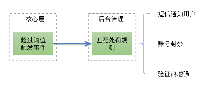 风控系统实际是包含两部分内容,一是识别风险,二是对识别后的风险或是自动的或是人工的进行处理。后台系统增加了惩罚管理,相对于原先风险处理硬编码在业务逻辑中,惩罚管理可以做到配置化的分级处理,当然响应可能没有以前及时,但也是近实时的。整体流程如下所示。