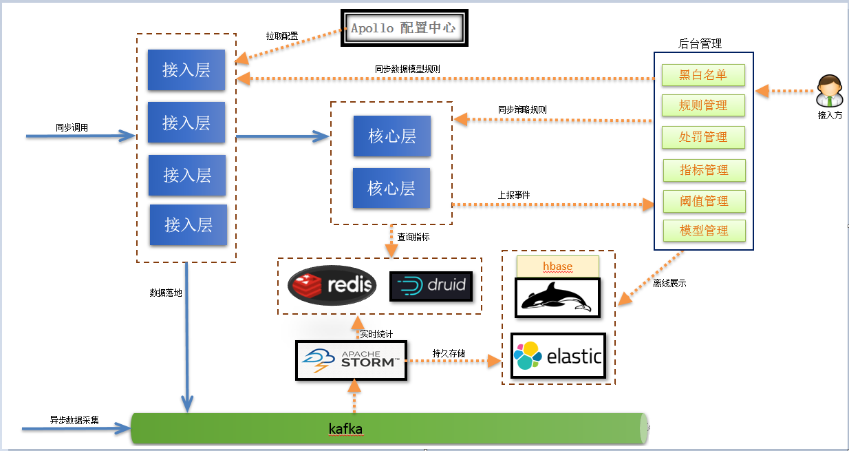 一般来说业务方在接入风控系统时需要先配置策略规则,然后设定每个规则对应的阈值和分值等级,完了就可以应用上线观测实际预测的效果,实际的预测结果只能依赖离线分析,可能需要对用户历史操作轨迹进行分析,如果预测结果拦截的都是正常操作的用户,这时可能就需要调整阈值。有了这个闭环就知道接下来需要做的事情了,后面所有的架构都是围绕这个闭环来进行。经过重新梳理后架构图如下: