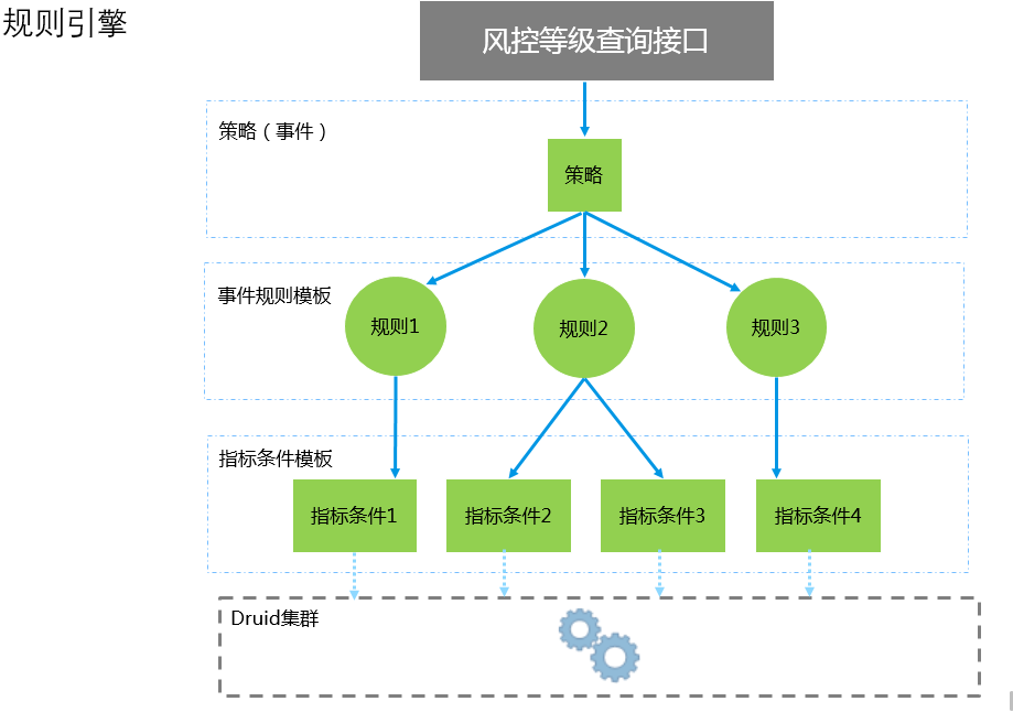 整个系统是一个单体结构,外部系统直接通过接口调用得到实时的风险等级标识,然后业务系统根据风险等级标识采取相应的措施,比如验证码或者拒绝阻塞。接口需要传入策略名称,策略是规则引擎定义的模型对应一组规则,每个规则都对应一组指标。风控系统的核心就是规则引擎,一个好的规则引擎可以方便业务方随时变更验证逻辑而不用重启服务。既要保证服务的稳定又要不失灵活性。规则引擎我们是采用执行groovy脚本,可以灵活变更规则逻辑。这需要对领域模型进行抽象,目前抽象出了策略、规则和指标关系如下图所示: